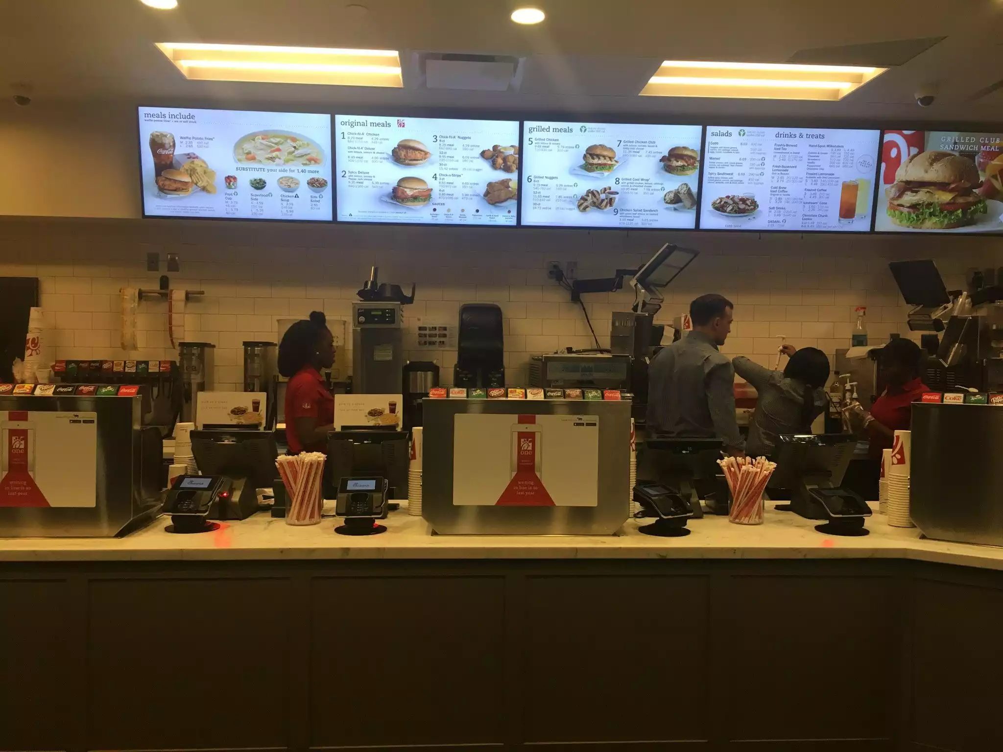 Everybody wants to eat here and the line to get in is quite long. nevertheless, there are scads of employees making the wait quite short. The food is predictable chick fil A and terrific.
