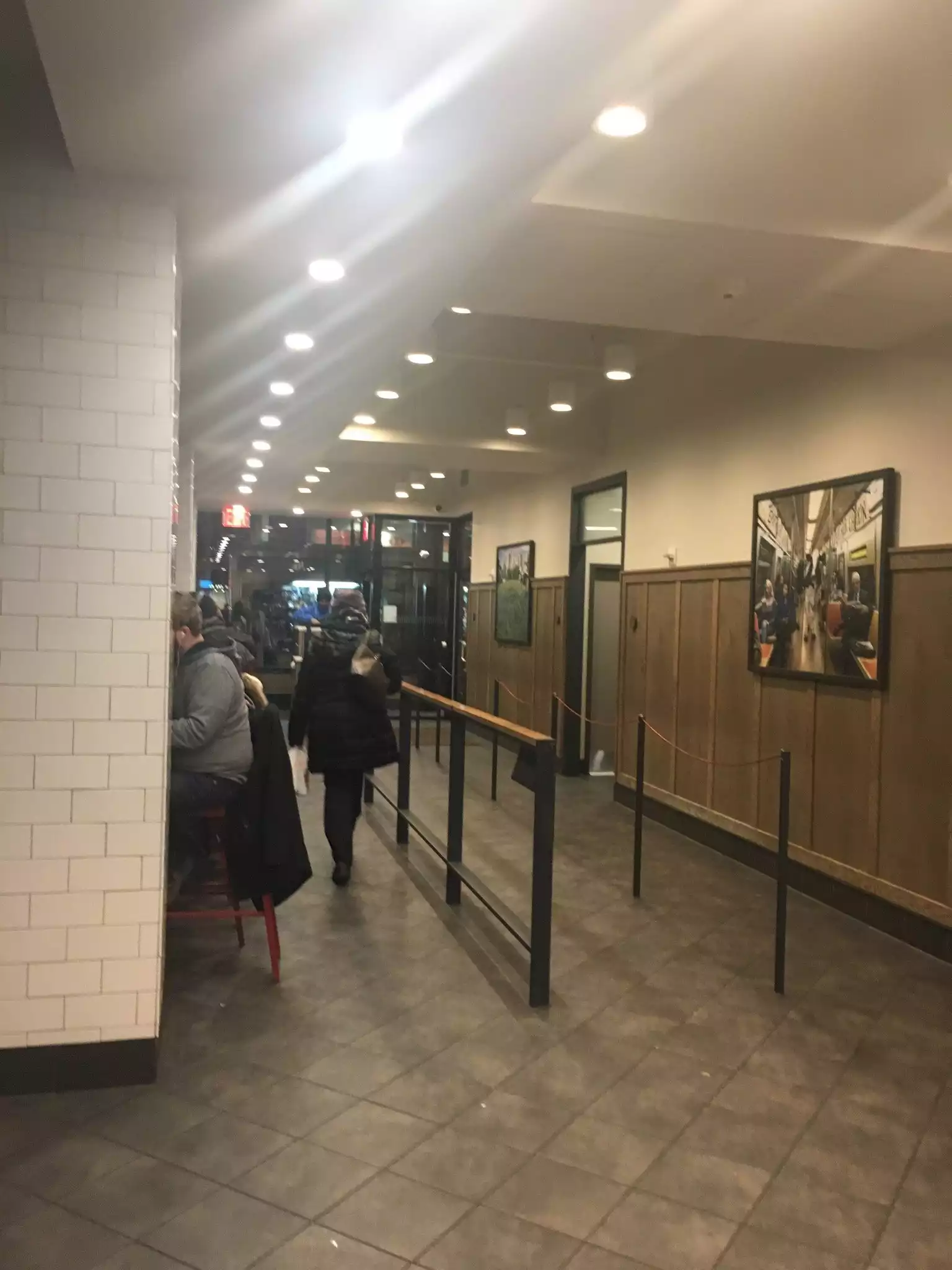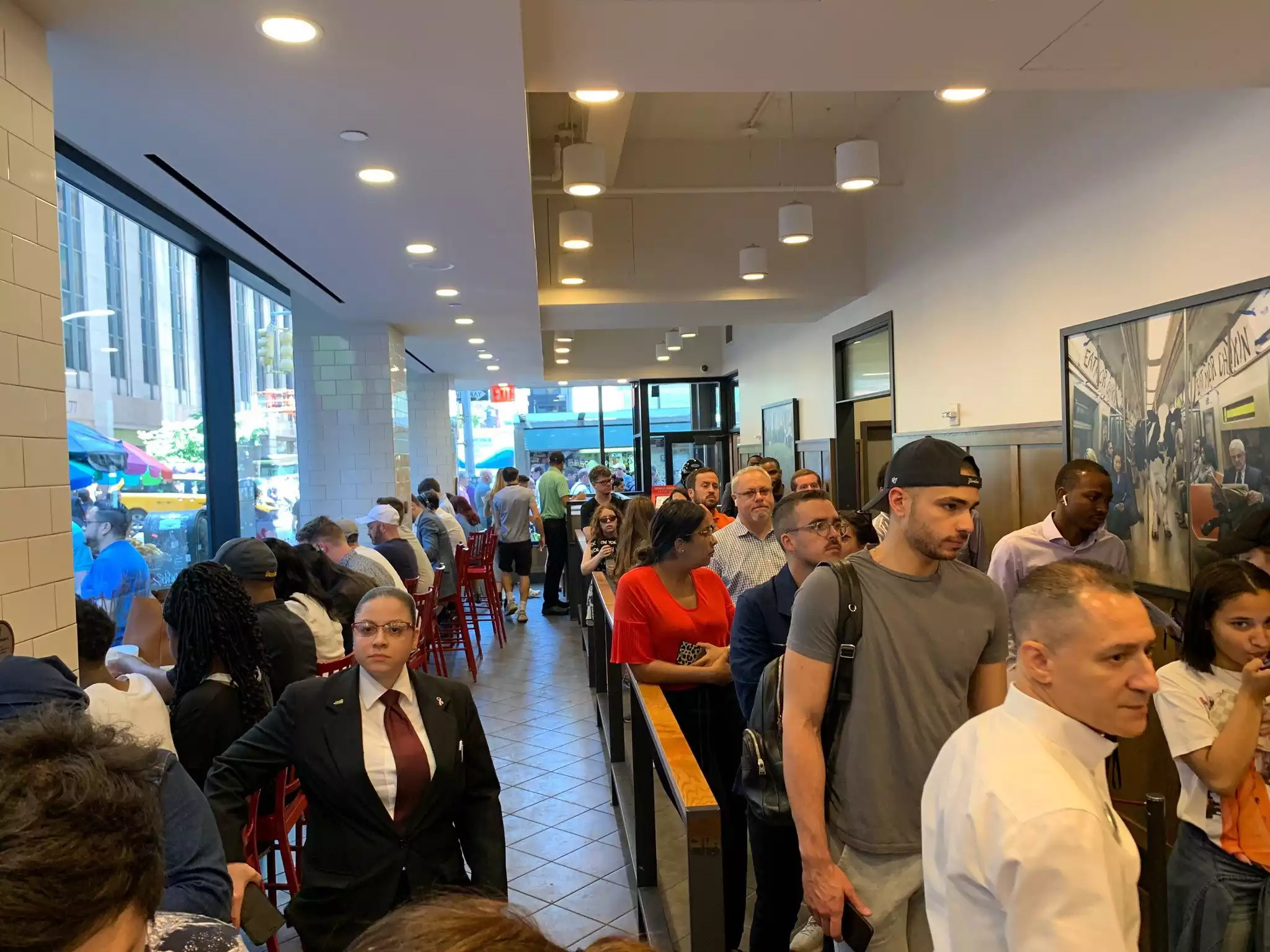 Walked in and we were the only ones in line at the time. Took a while to place our order. Once the order was done we were given the receipt and that was all. No idea where to get our food from but had a good idea when we saw where the other workers were at. We had two separate orders and their food was already made and sitting in a warmer, not sure how long but that seemed like a good idea considering how busy they got. There were at least 20 people behind us after we ordered. Once they started they got in a groove and started pumping out orders and giving them to the people waiting. They did very well with one or two people but we had 6 and that seemed crazy long for our food even with having it already premade. The cost is almost double for the food compared to my hometown in Toledo. There is no place to sit and the only place you can eat at is a bar top area along the window which was full from other people. Considering it is New York you kind of expect it.