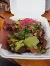 Read many outstanding reviews of Chicken and Guns food truck so we thought we had to try them. We were disappointed. We had the dark meat chicken and it could have been cooked a bit more. It was not falling off the bone. The potatoes served with the chicken were good. Best of all was the spicy guacamole sauce served on the side. Licked the container clean of that stuff. What is nice about the food cart pod here is there is covered seating area to eat your food.