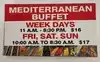 A really good Mediterranean buffet! Great selection, with probably more than 20 selections, plus 3 or 4 dessert options. Slight downside was the pita bread, just didn't seem freshly made. Taste was good, but texture was too dense. Smallish restaurant, with tables very close to each other - while it was not necessary a relaxing lunch, it was just great food. Free off-street parking. Service was friendly.