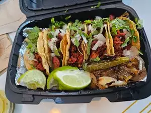 Delicious street tacos. It was a pack of 5 we got the pirate which was steak and they were delicious. We also shared chips and beans