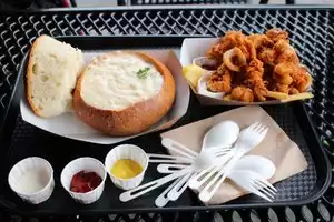 Wanted a quick late lunch that didn't set us back $100+. One got the chicken strips-pretty normal. One got clam chowder bread bowl and calamari-was ok. I got crab chowder bread bowl. I enjoyed mine, however, I wish it had had a little more chowder.