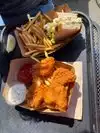 There is no inside seating here so I would hate to go while it is raining as I am not sure the cover would stop you from getting wet. There was enough of an issue that it was cool when we went that it did not feel the best. I had chicken fingers which were tasty and my wife had fish and chips and her fish was well done and tasty. The fries however left a lot to be desired... if they made their own fries instead of the thing pre-packaged stuff they served us it would have been so much better. They prices are excellent and overall we were pleased!