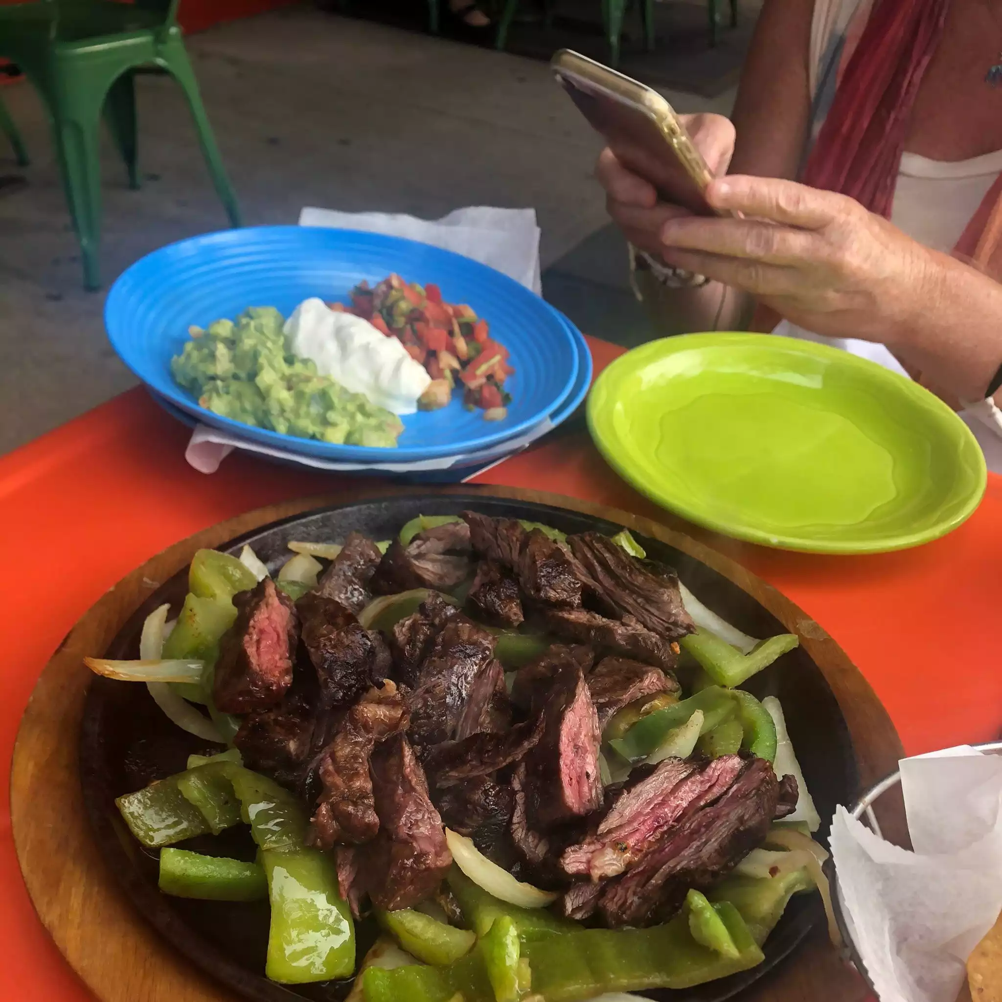 Large portions, good service, dining outside. Had Fajitas. very tasty . good guac. Accepted reservations l;ast minute while I was in the city looking for a place. would recommend for a quick bite or leisure.