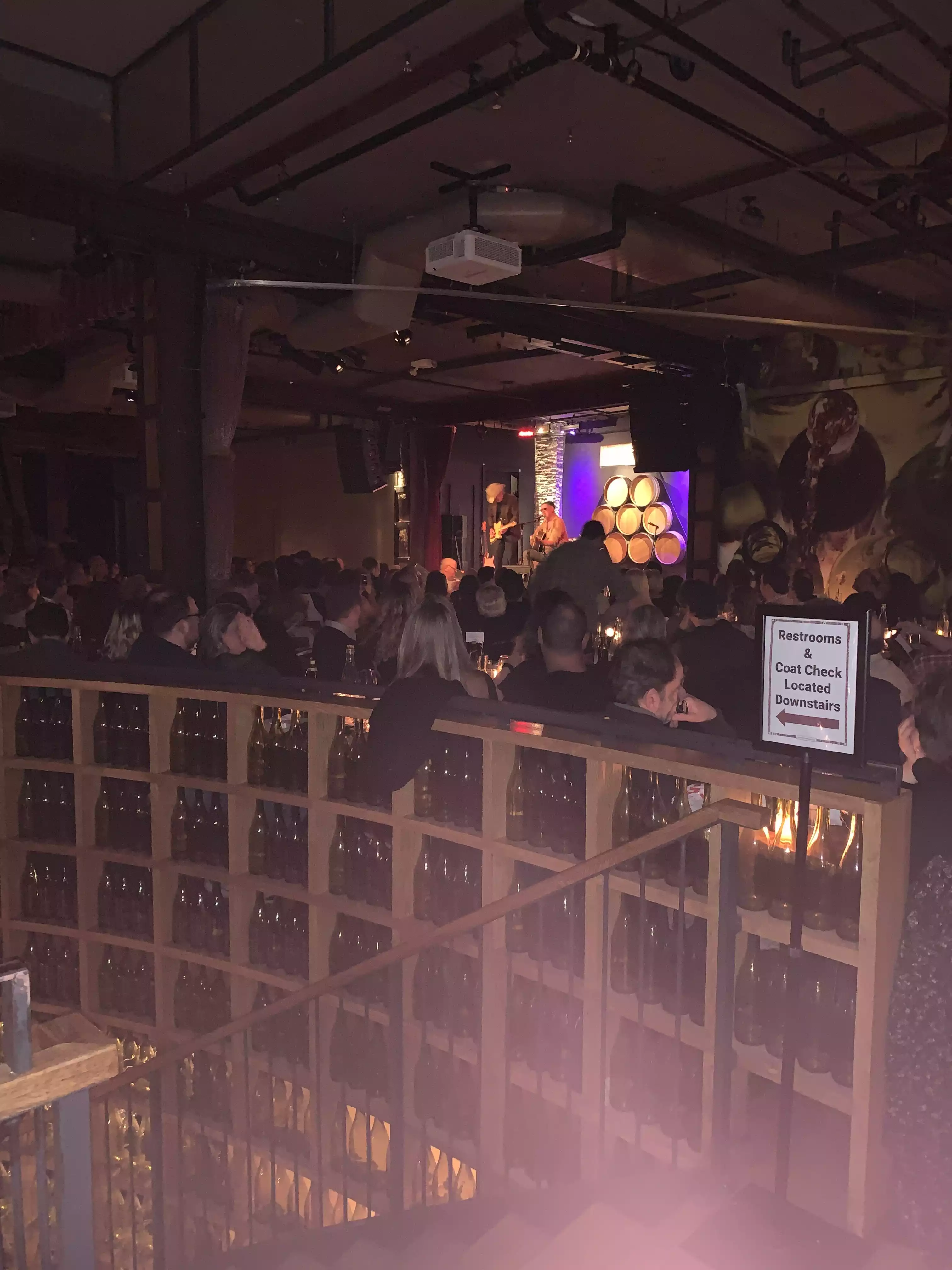 small space holds only about 300 people, so everyone has a great seat. wines are good, we had some appetizers here which were also good, but the tables in the main area are too small for dinner. maybe if you go early for dinner they have bigger tables in the barrel room?