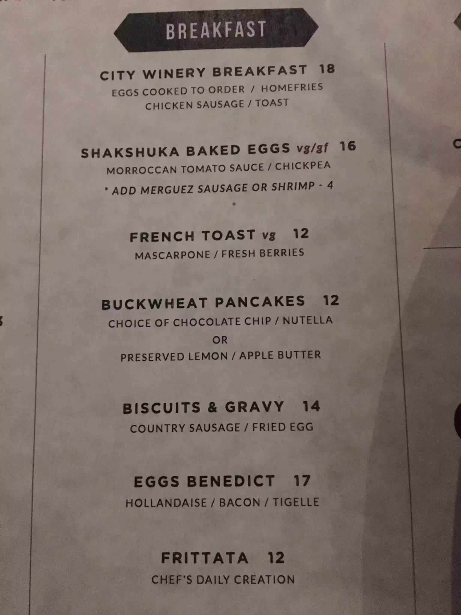 Five of us attended Klezmer music on Sunday with option ordering lunch, which we did. My wife and I left after 2 and half hours of music. Great music but NO FOOD provided. The most inept kitchen and service that I experienced on NYC ever!! Even after we pointed to our server and the manager that we did not get our food after waiting patiently for 45 minutes, still nothing was done. CITY WINERY never again!!