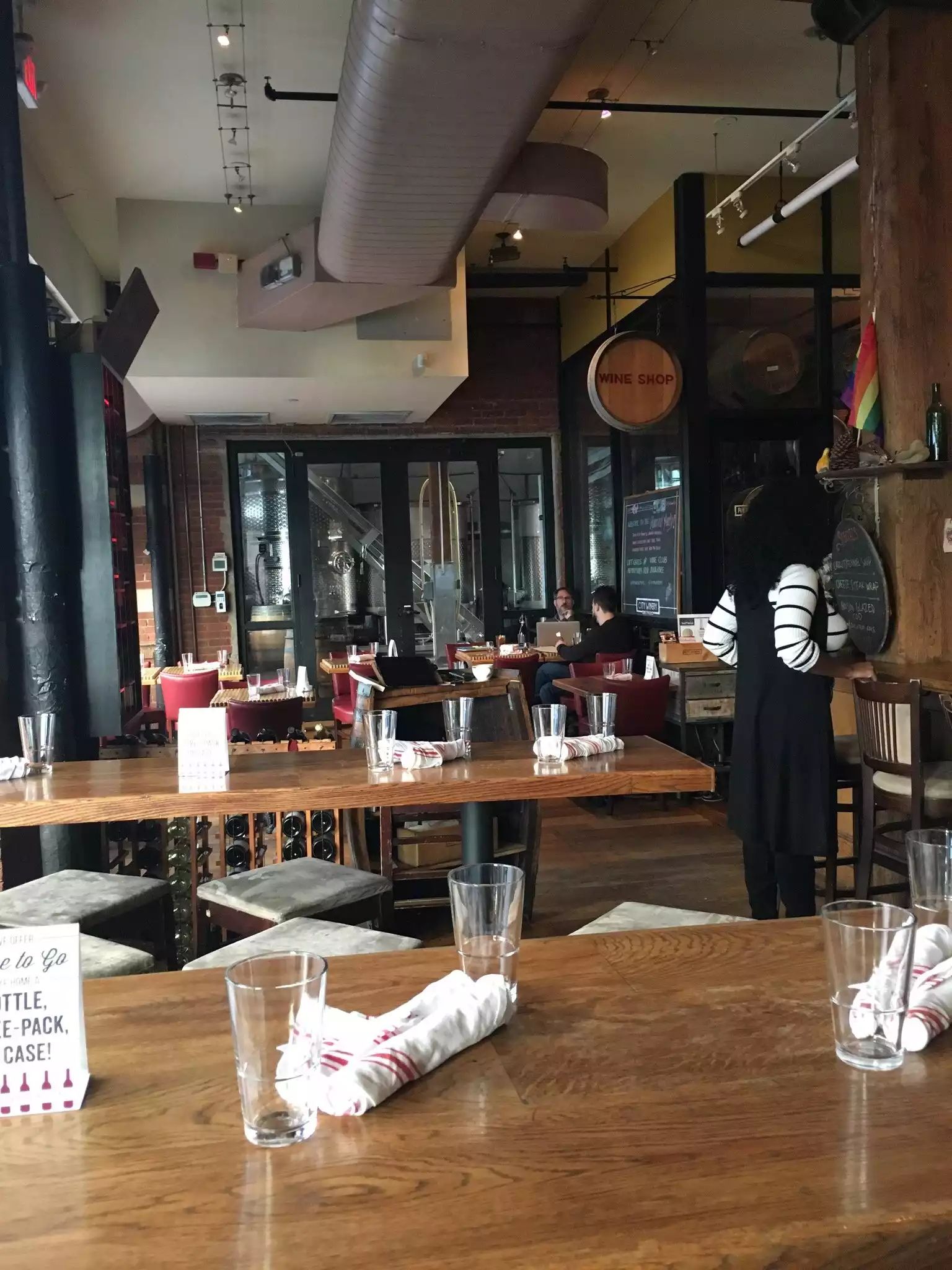 My wife and stopped in for a glass wine after walking around SoHo. The wine is on tap with a nice selection of by the glass local and national wines. The Cit Winery has a very pleasant atmosphere and friendly staff. You can see the barreling process in one room, wine and dine in another, and they have a concert area in the next room. My wife had a glass of Spring Street Pinot Noir 2014 and I had the Stagecoach Merlot 2014. They have a small eclectic menu and offer wine flights also. A hostess came by after we had been there about 15 minutes and offered us a malt wine. The wine was warm with whiskey and spices. VERY GOOD! The City Winery was a great place for us to relax in a nice atmosphere and receive good service and good wine. They also sell wine to take home or to your hotel at reasonable prices.
