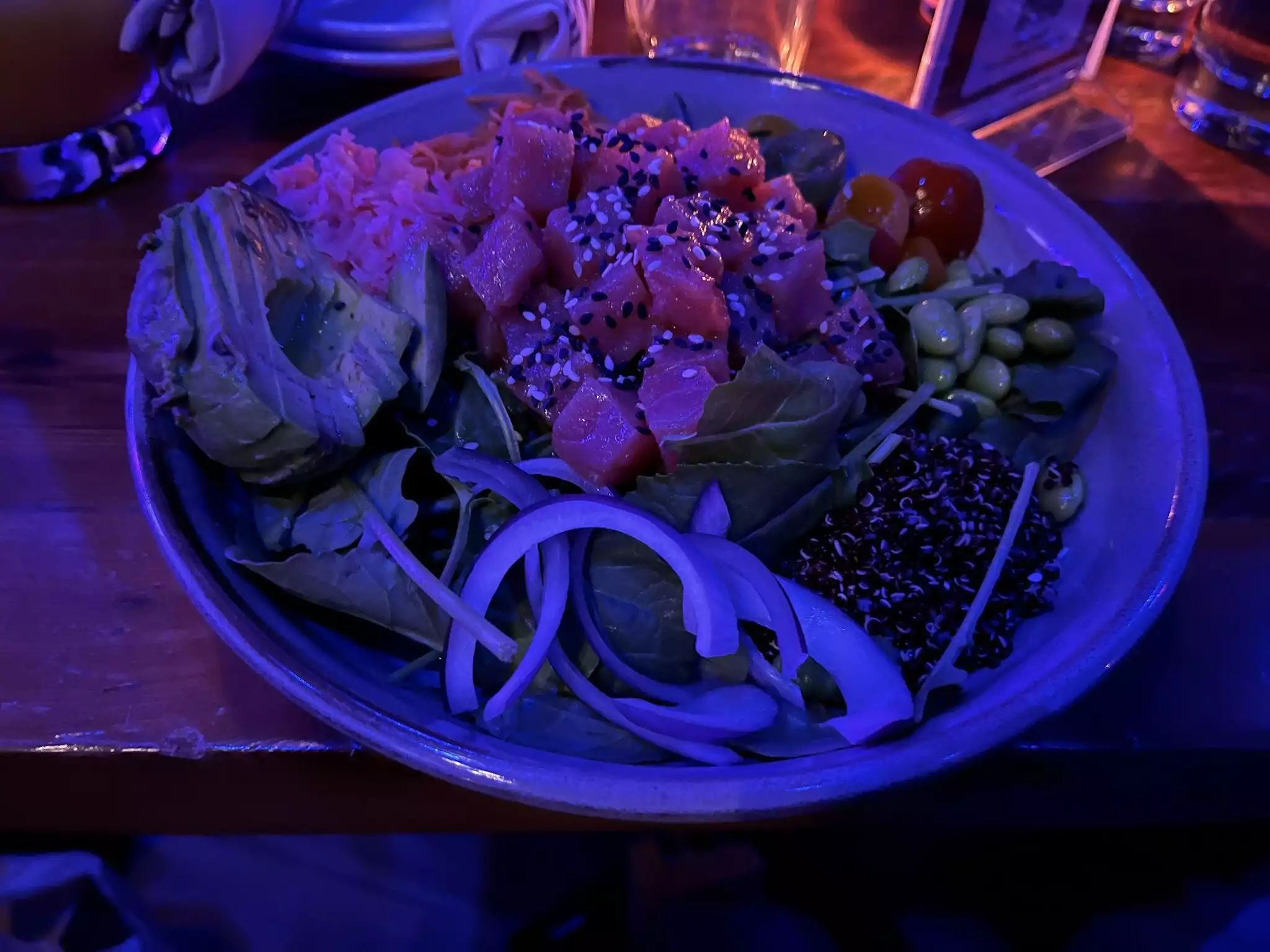 Lovely tuna salad bowl Many tuna and vegetables and seeds We had great time with live music Lovely water view I can see the little island next to it Great view day and night I will be back next time