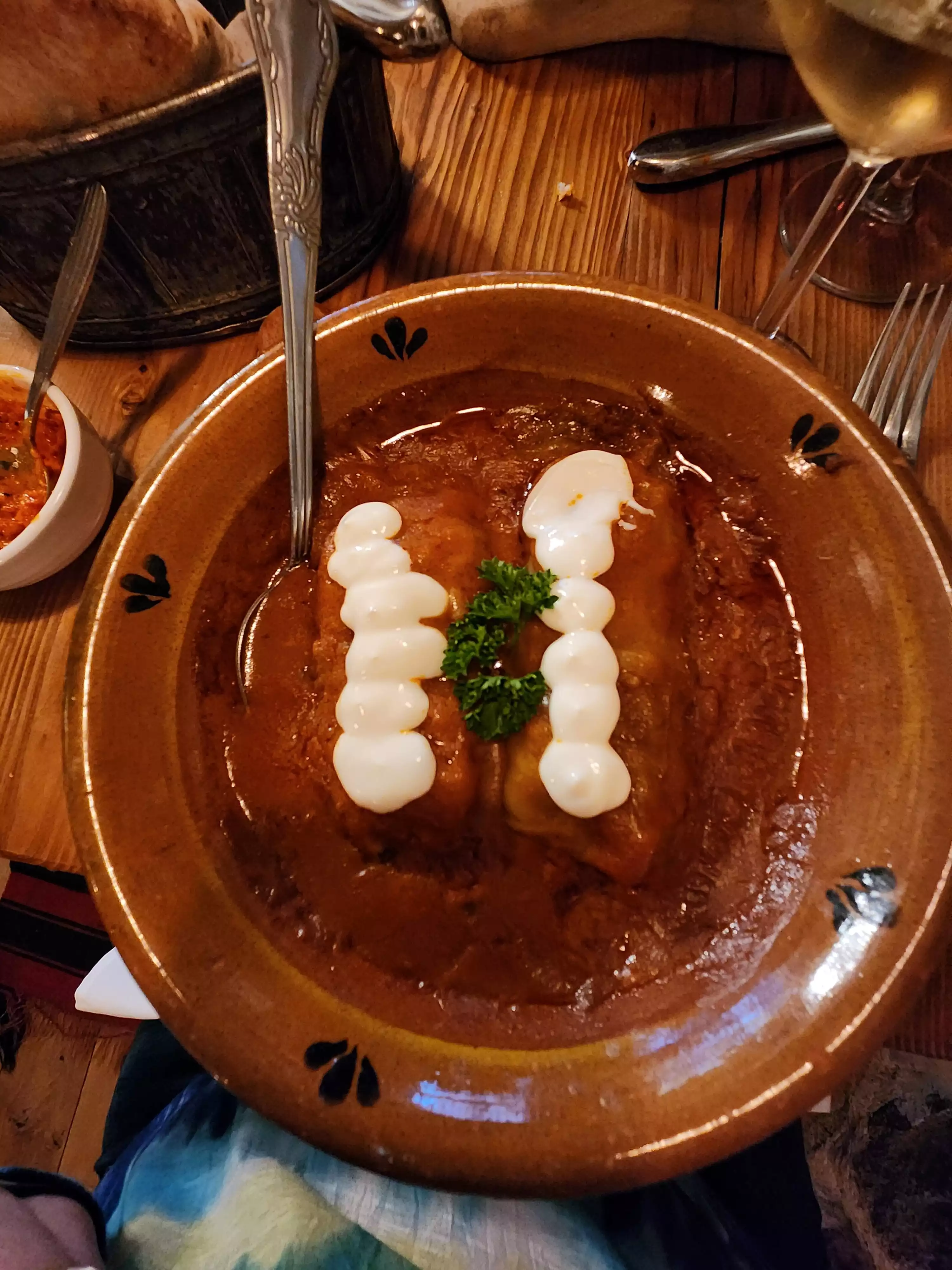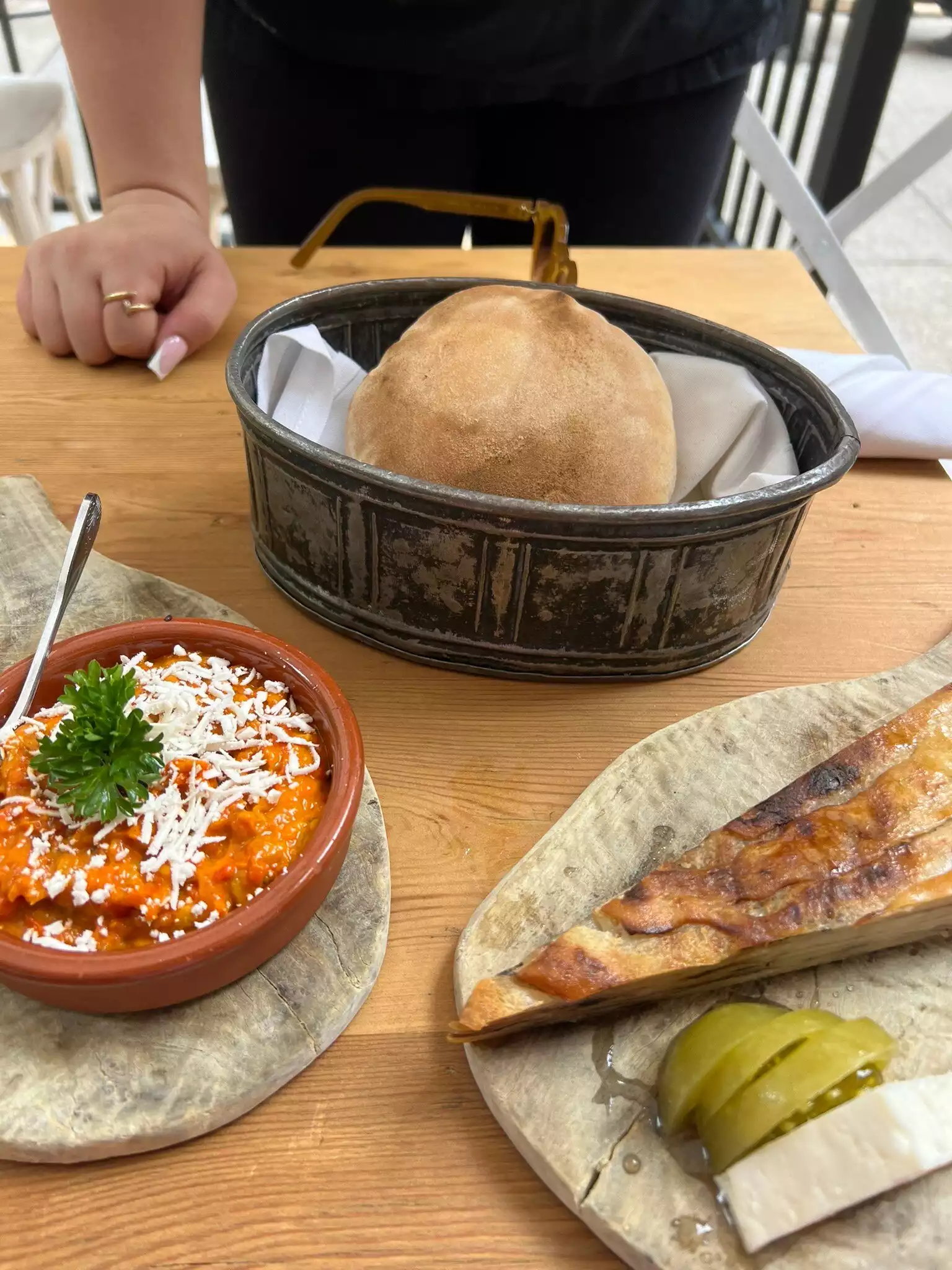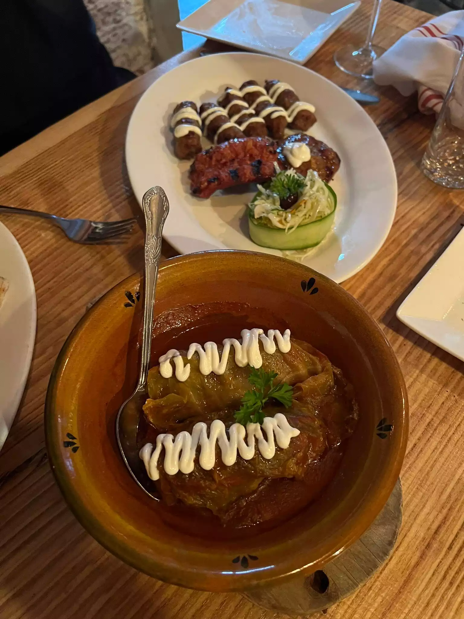 We chose this because it was open on a Monday evening. The food exceeded our expectations. We started with bread and roasted red pepper spread, and it set the tone for what was to come. I had the stuffed cabbage (Sarma) and my husband had veal meatballs in a yogurt sauce (Mantia). Outstanding. But we managed to find room for desserts! I had the Sheqerpare (almond pastry with lemon sugar syrup) and my husband had the Albanian trilece (a tres leches cake with a caramel topping). This is a meal we will remember!