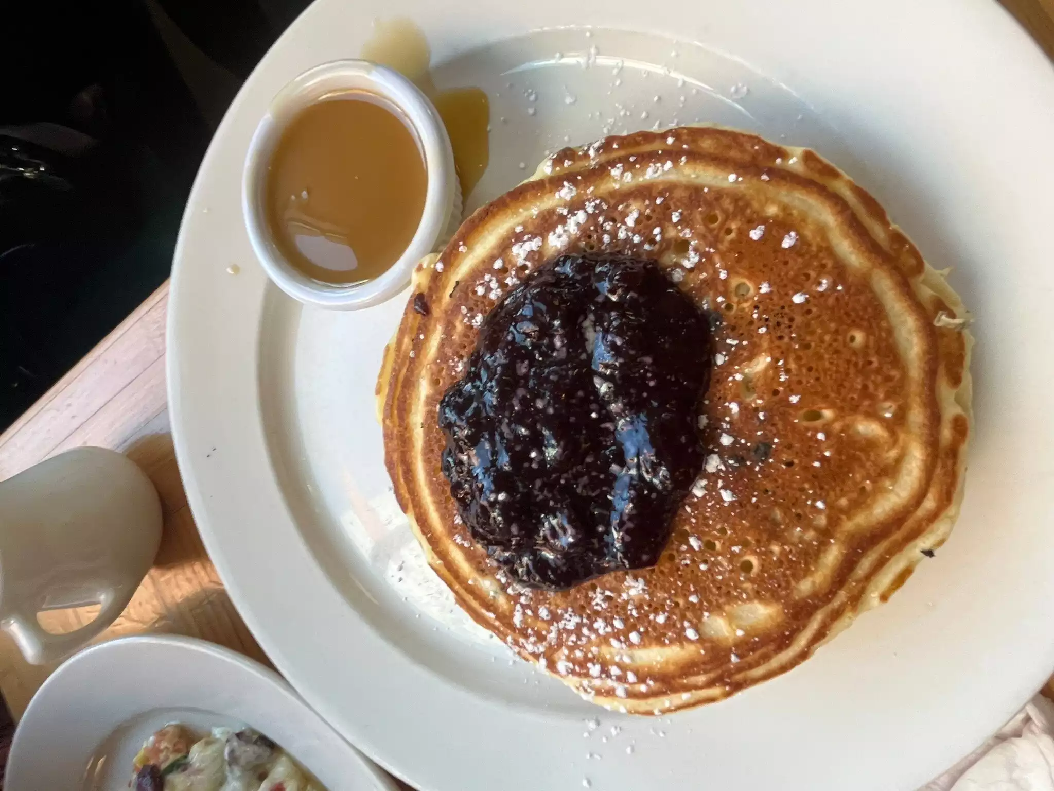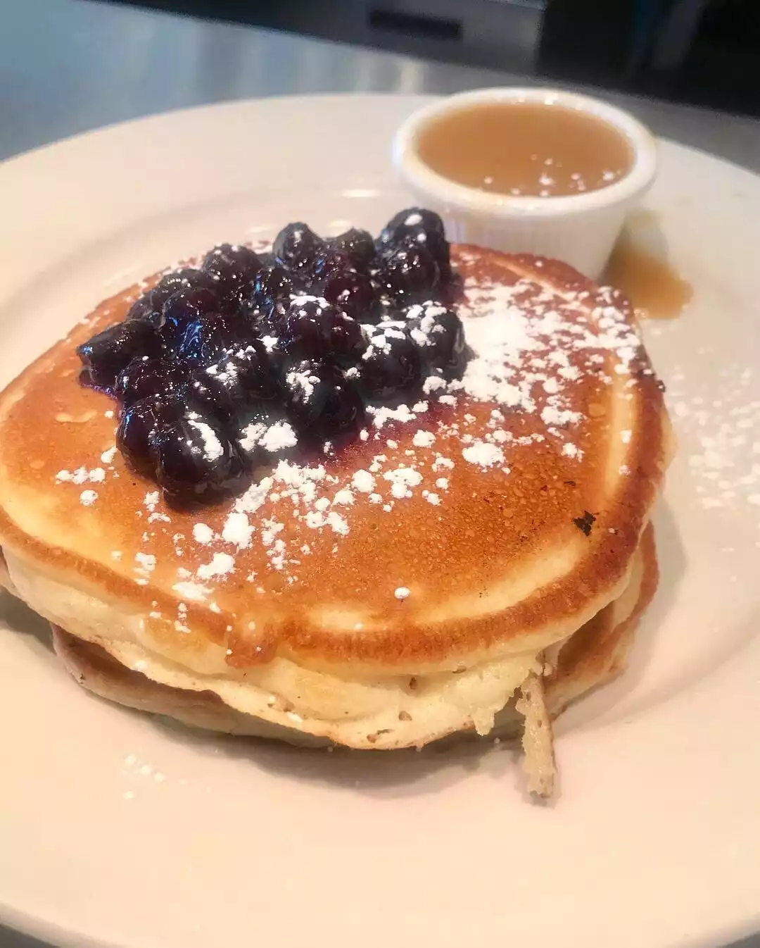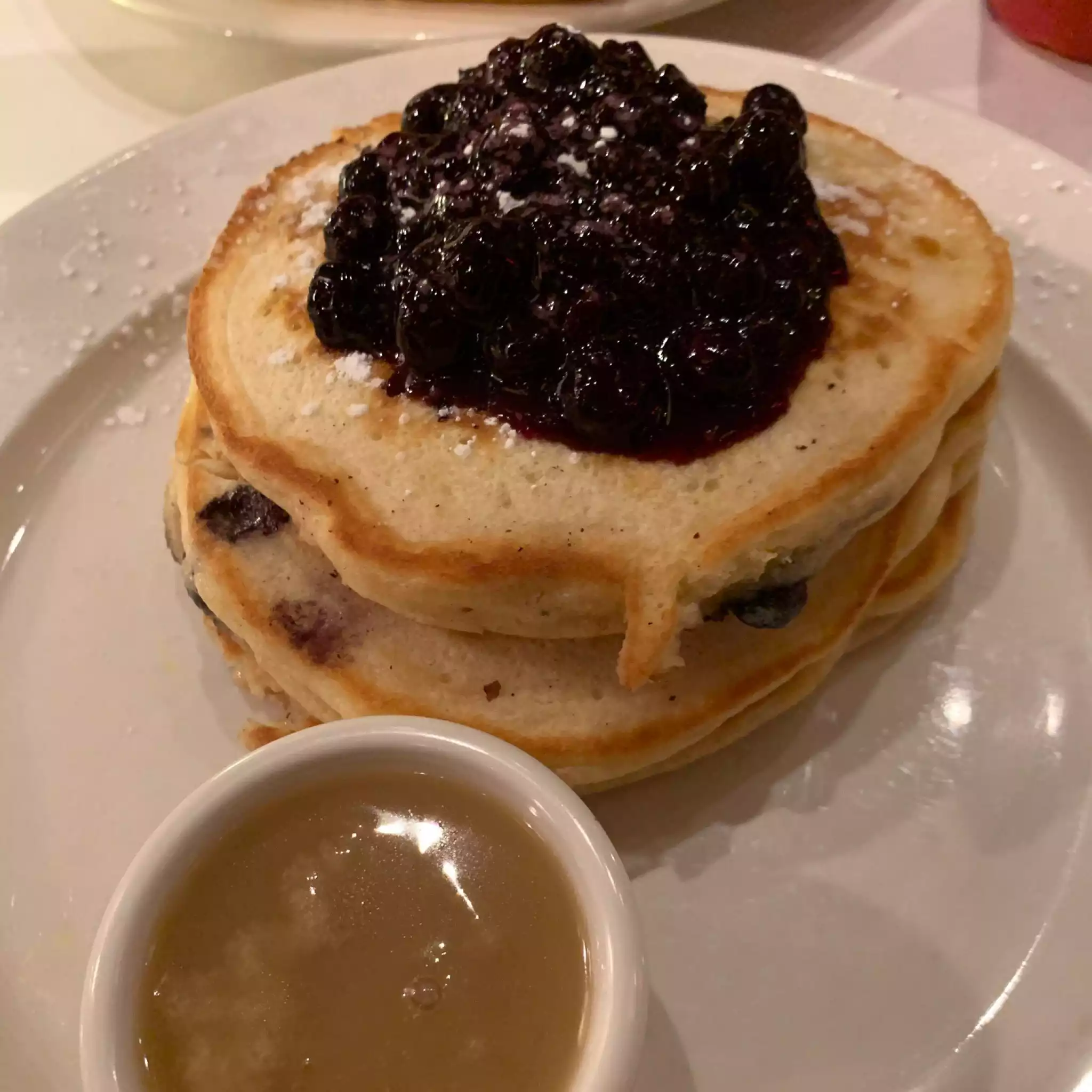Best blueberry pancakes ever! The pancakes are served with warm maple butter and blueberry compote. Truly next level even as takeout. Muffins and scones also delicious! We went many times over three weeks and always got takeout due to popularity! I will mention that they also have a very tasty crispy chicken sandwich for lunch or dinner!