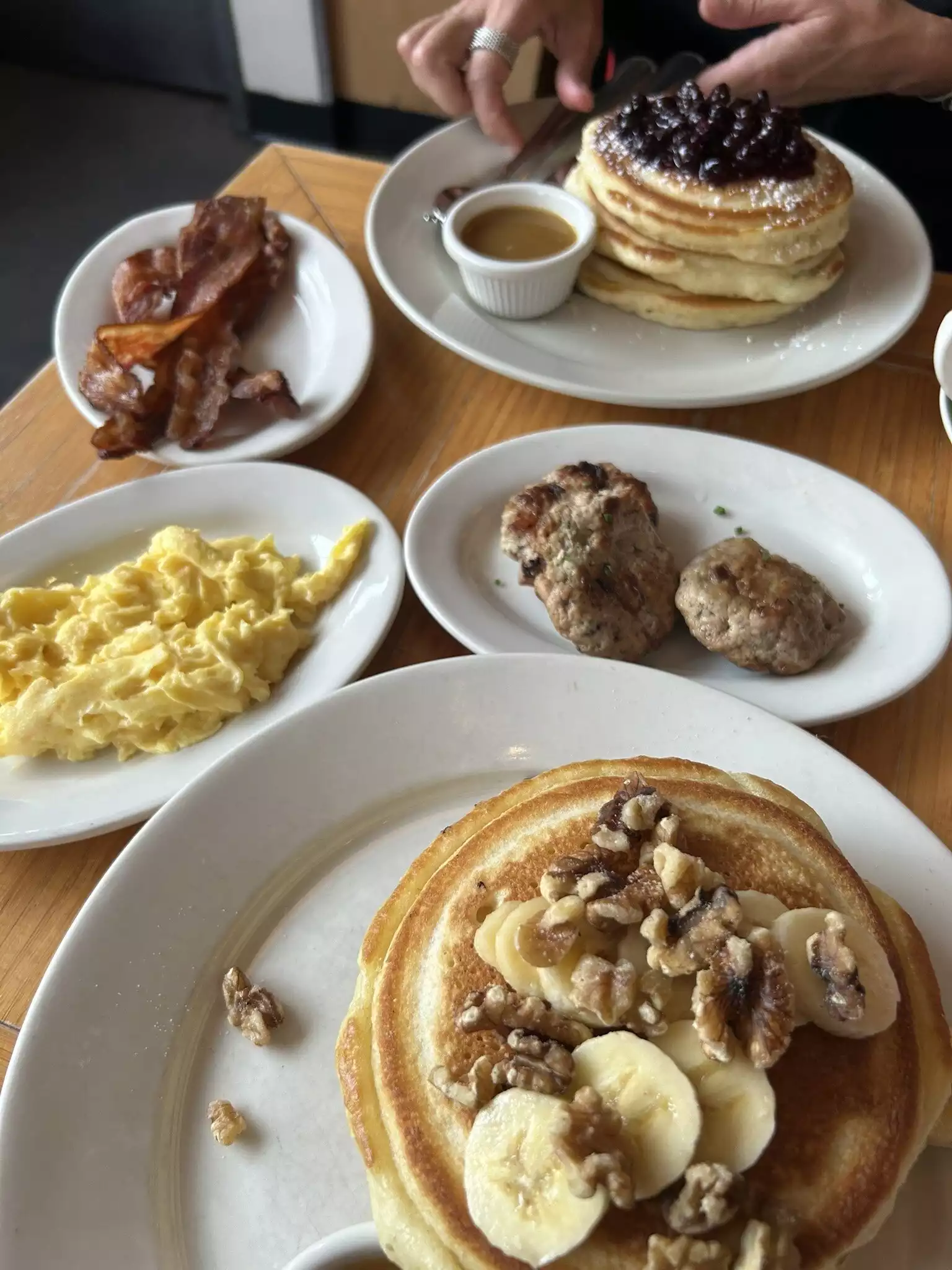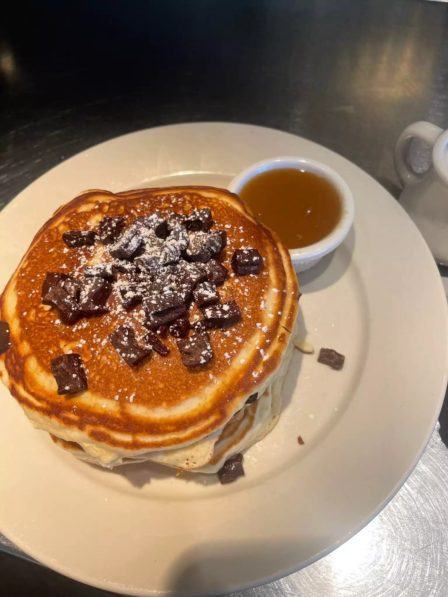 It was packed but because I was alone, I was seated promptly. I had narrowed down between two choices but wasn’t sure what to go with so I asked the server for her opinion. She was really nice and suggested I order the chocolate chip pancakes over the farmers plate. It was sooooooo moist and delicious. The maple butter syrup was also equally delicious I would definitely come again to try the farmers plate. I read the reviews on here and came prepared to pay cash so no problems.