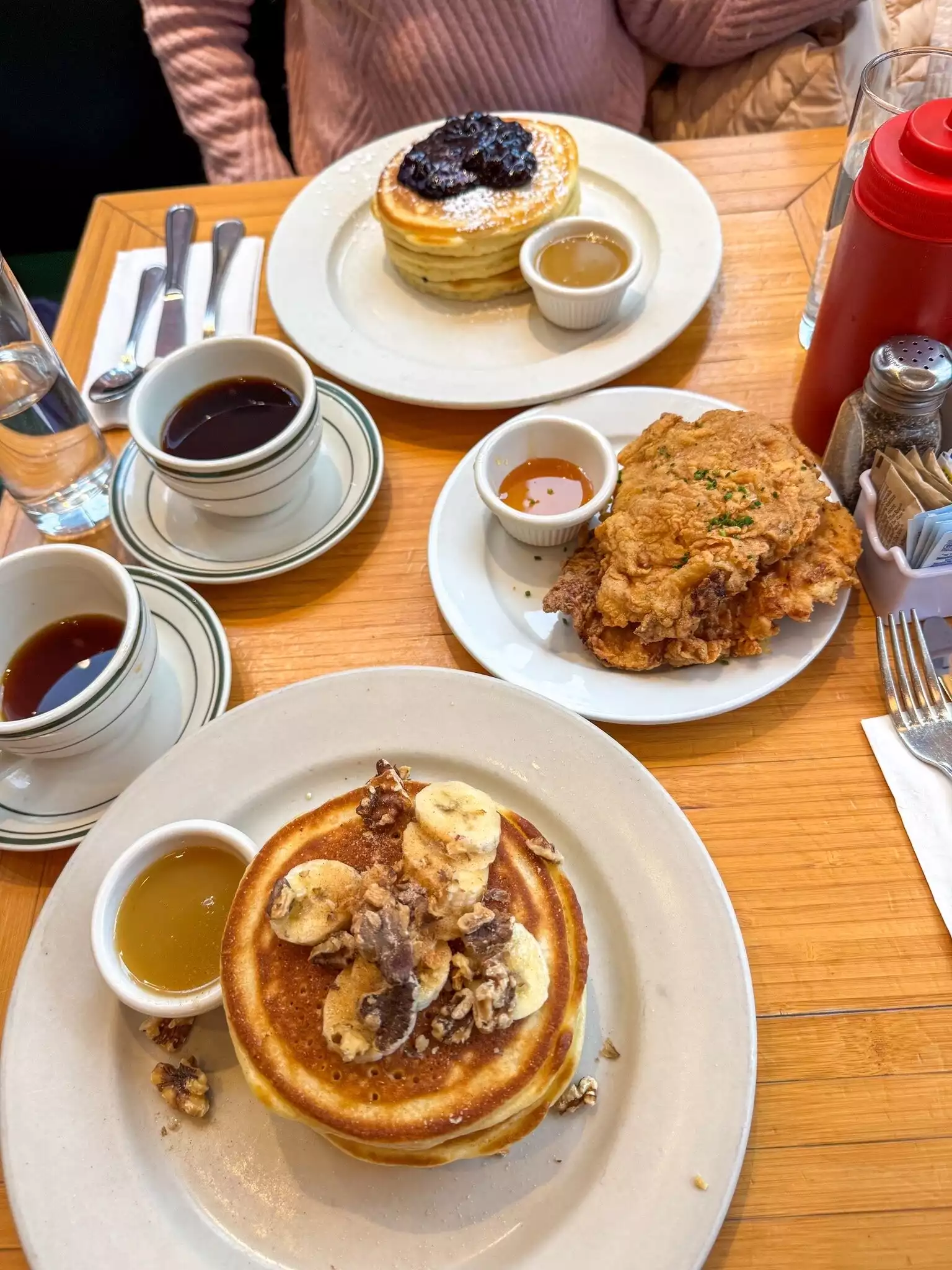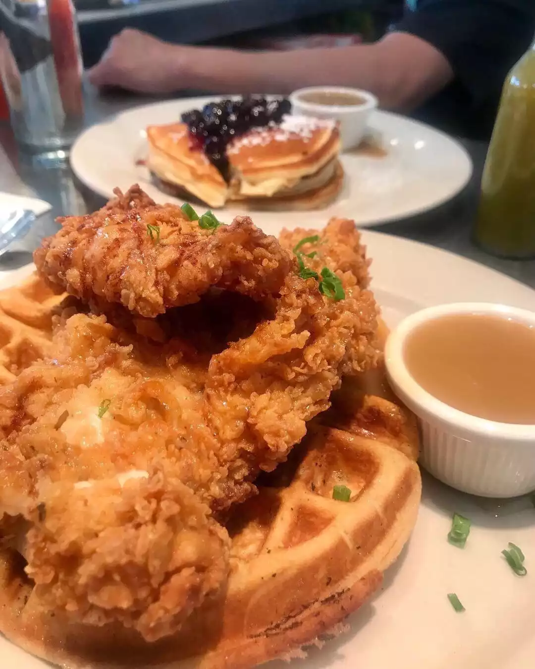 It was fast and busy but the pancakes were delicious. We had booked which is advisable as it’s a real popular place. Husband had chicken and waffles and did not need to eat anything else all day. Huge portions. Very good