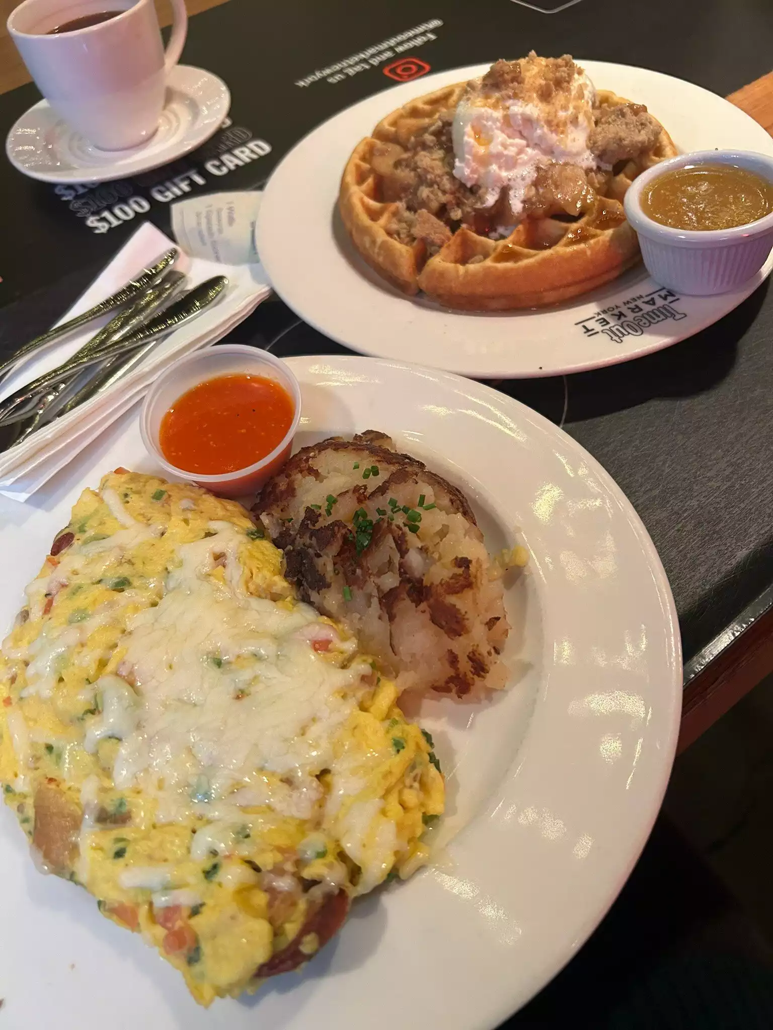Quite a busy restaurant with 30 mins waiting times however as a solo diner i was seated immediately at the bar. I had chicken and waffles ($18) with unlimited coffee ($5). Both meals were good and honestly I was full the whole day until dinner time including walking around New York city. Portions are generous and the pancakes looked good too, from what I spied from other people's plates. Wifi would have been nice.