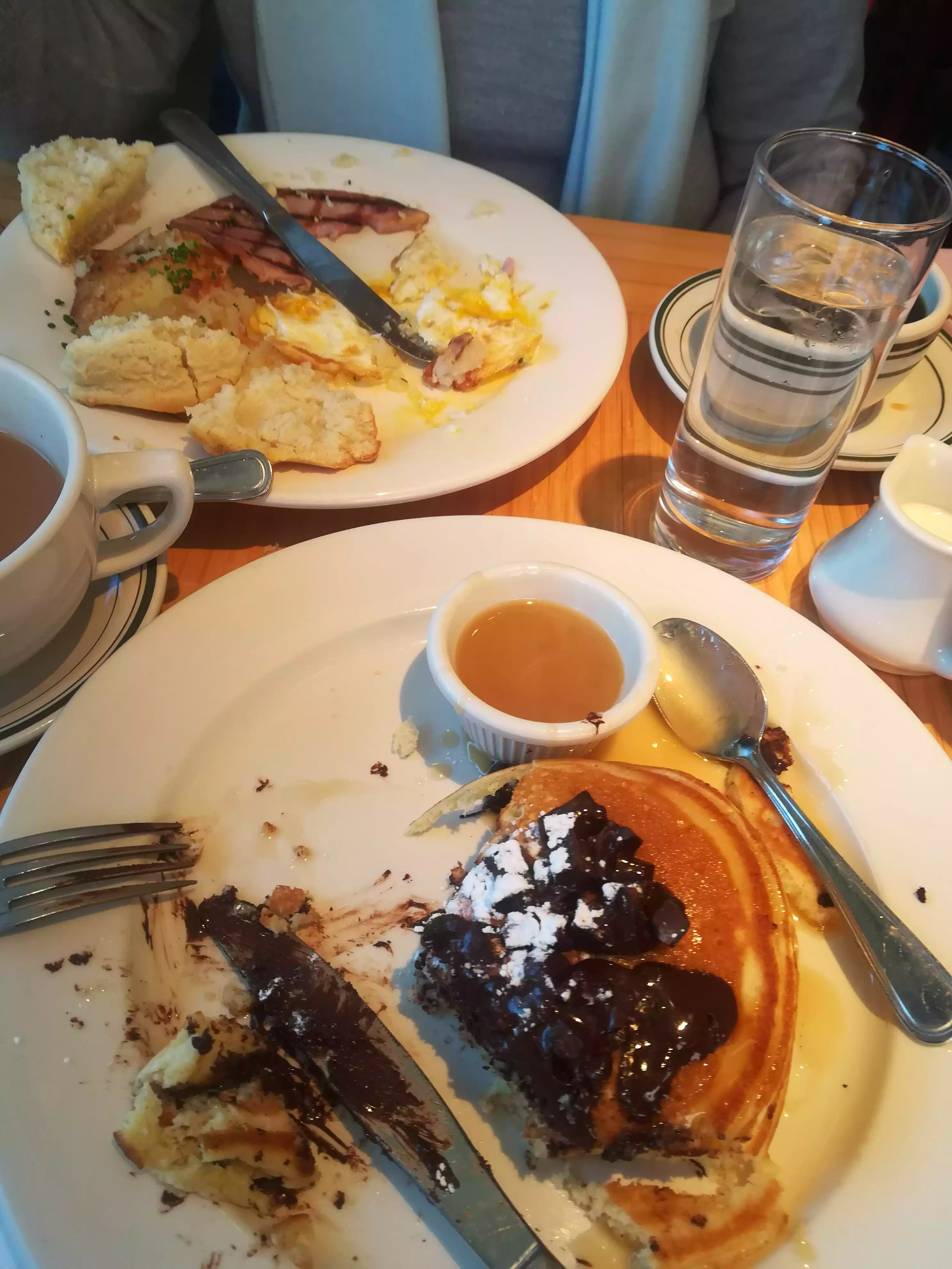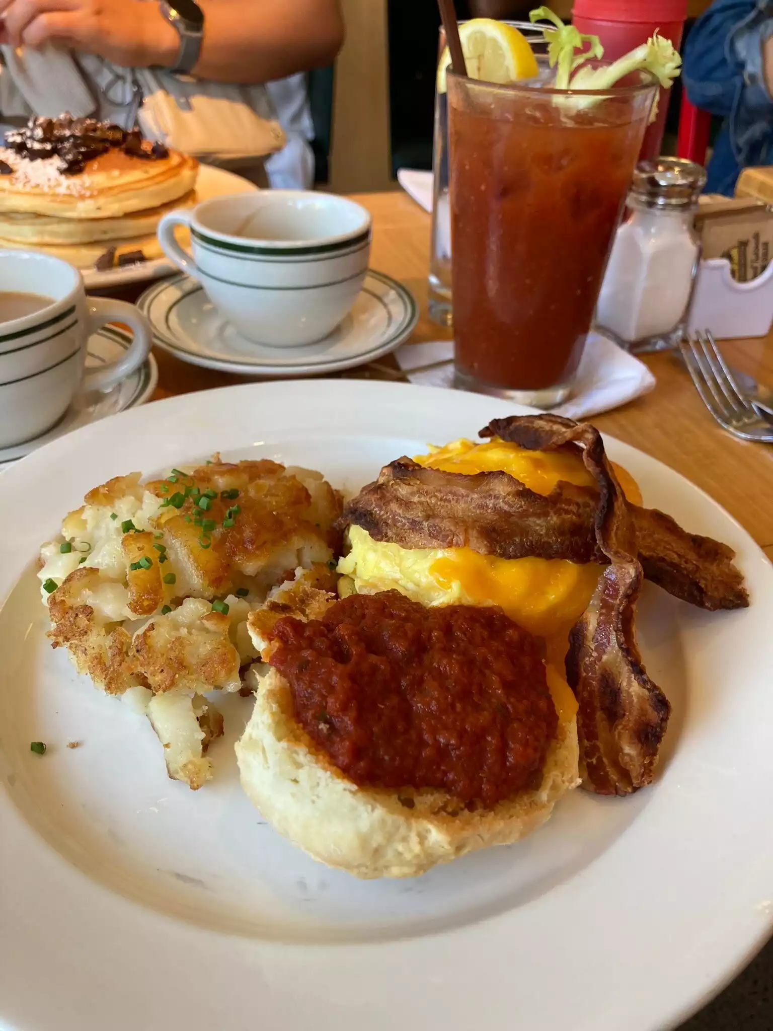 What a way this was to start our day. We ordered butter milk biscuits (very much like scones) with scrambled eggs, melted cheese, bacon and hash brown, chocolate chip pancakes, a Bloody Mary, orange juice and bottomless coffee. All of the food was terrific and the coffees and water refilled with great regularity. A superb breakfast and great value..,