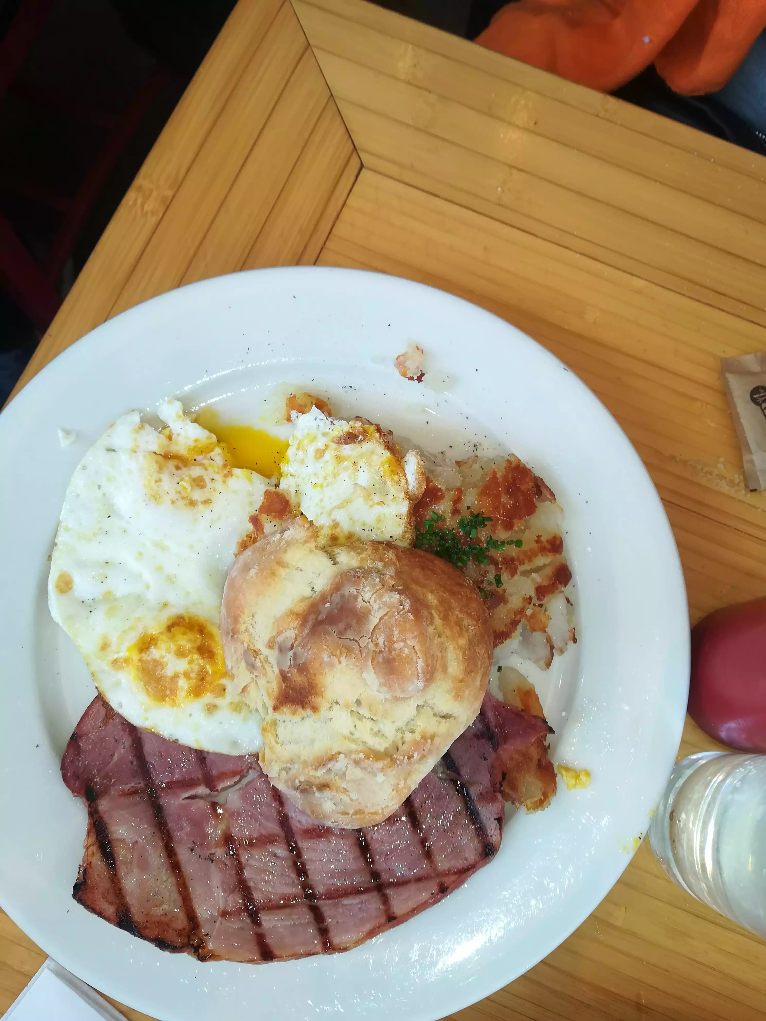 Decent breakfast foods at acceptable prices. I had the Country Breakfast and it comes with three eggs, ham, a biscuit and hash browns. It is a decent meal at an acceptable price of $18. The eggs were ordered over medium and came over well done. The ham was a decent size and very good. The Biscuit was hard and came only with raspberry jam, disappointing overall. The hash browns were okay. The Banana Walnut Pancakes at $18 must have been okay since they were completely eaten.