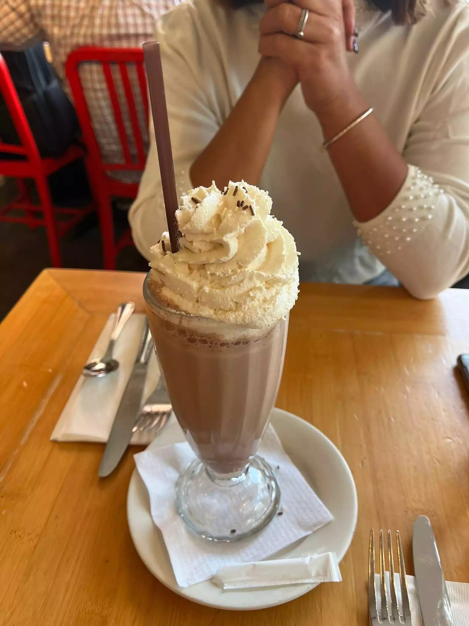 We walked in without a reservation and got a reservation 45 minutes later by a friendly employee. When returning, we got a great seating at one of the booths. Decided to try the famous pancakes and a chicken sandwich with fries combined with milkshakes. Both milkshakes were served swiftly and tasted really good. The food was a more strange experience. The pancakes were just as good as expected served with maple butter and berries. The chicked sandwich on the other hand was overcooked and tasted burnt and dry. The frites was also not the best, and looked a bit sad. Service was friendly and efficient overall, given the extreme pace of the restaurant through lunch.