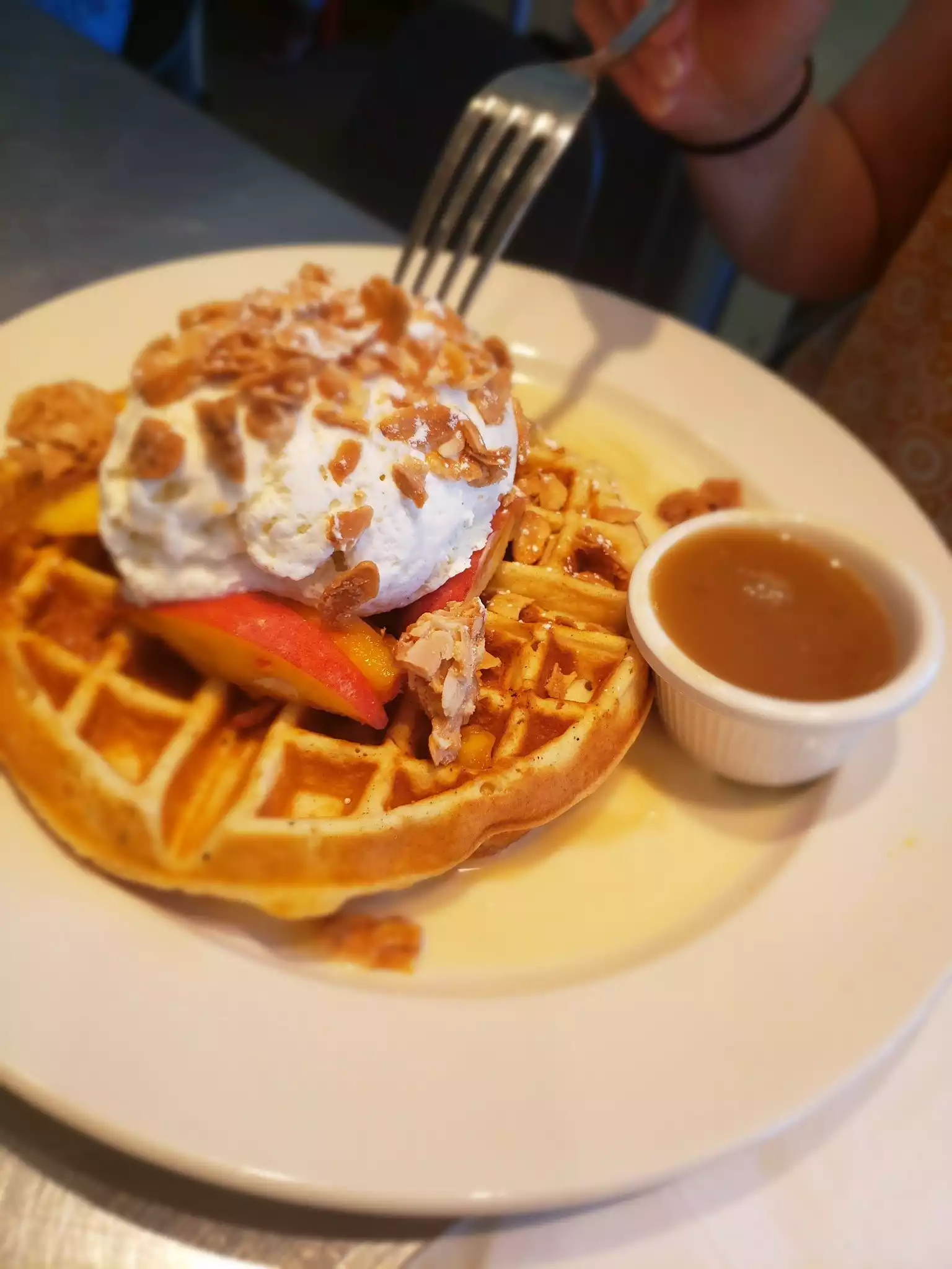 The place is good for having breakfast and delicious waffles and one can come here with friends and family for breakfast