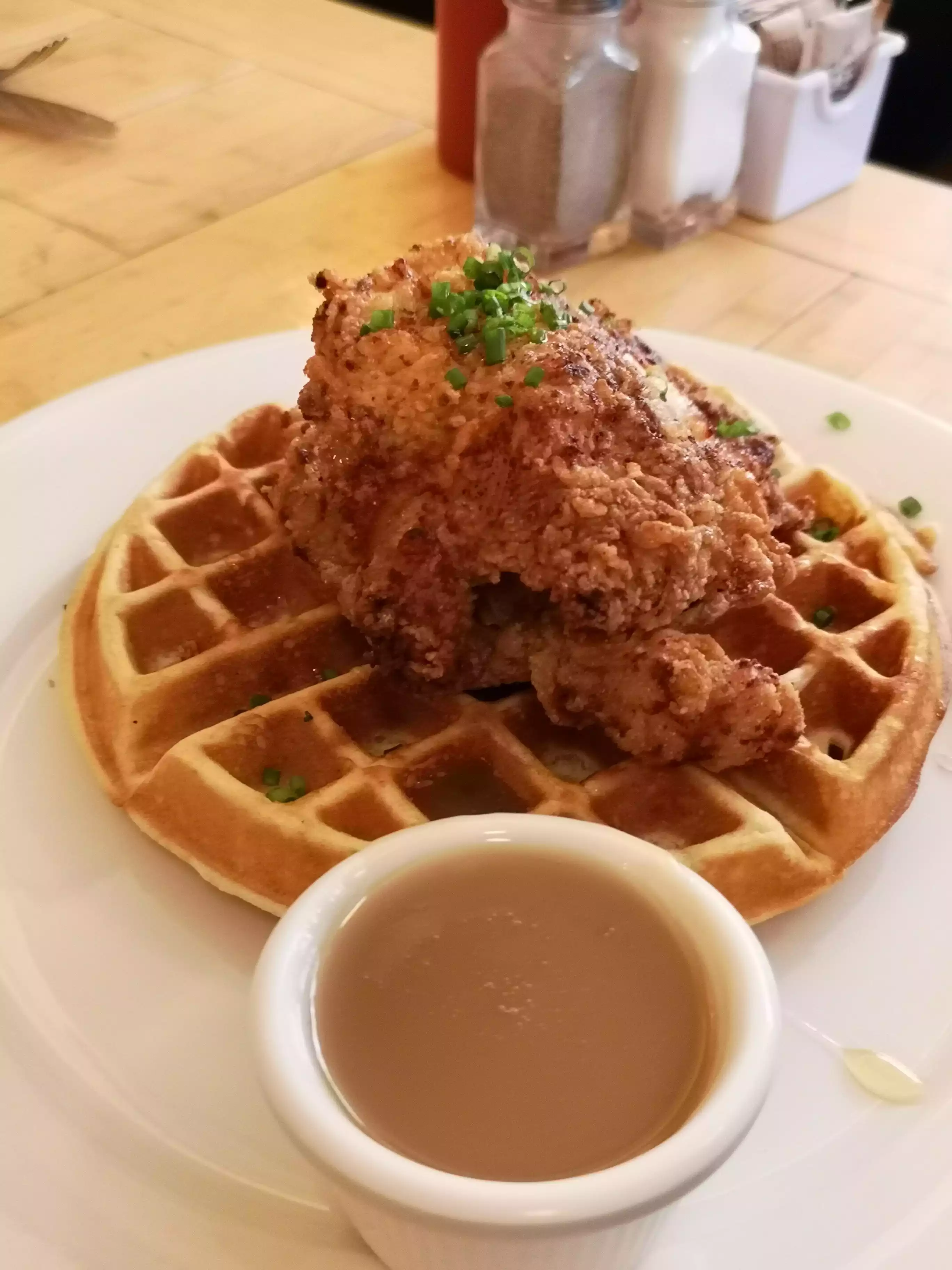 Amazing fried chicken waffles and hot maple sauce - chocolate shakes - great service fabulous neighbourhood to walk it off. Great service — really good food.