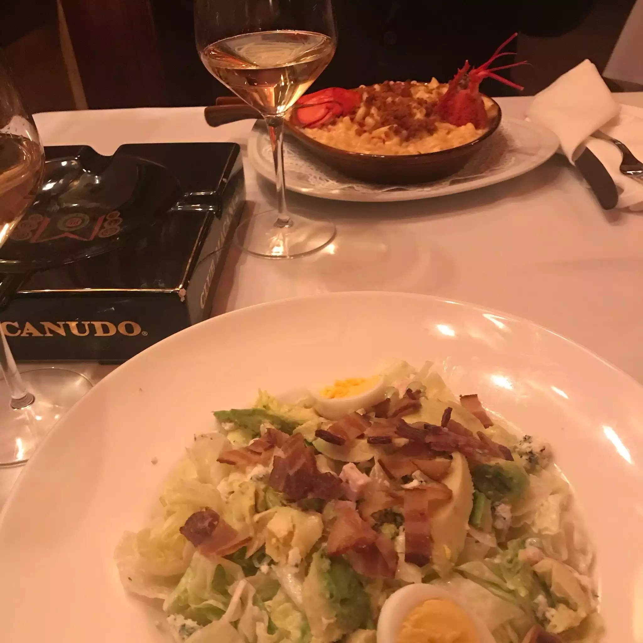 I took a customer to dinner here at their suggestion. The restaurant has a very upscale men's club ambiance to it. Every table was packed out. I was one of the few people there who was not smoking a cigar. The Old Fashion drinks were ok. I actually got charged for 1 round more than we actually drank. My meal of Shrimp Cocktail (huge shrimp) and Grilled Filet accompanied by a glass of Bordeaux Castera was outstanding. I really enjoyed the food. A glass of Fonseca Tawny Port was my dessert. Needless to say, my clothes were saturated in cigar smoke. I had to use the steamer feature of the iron in my hotel room the next morning to get the smell out of my suit.