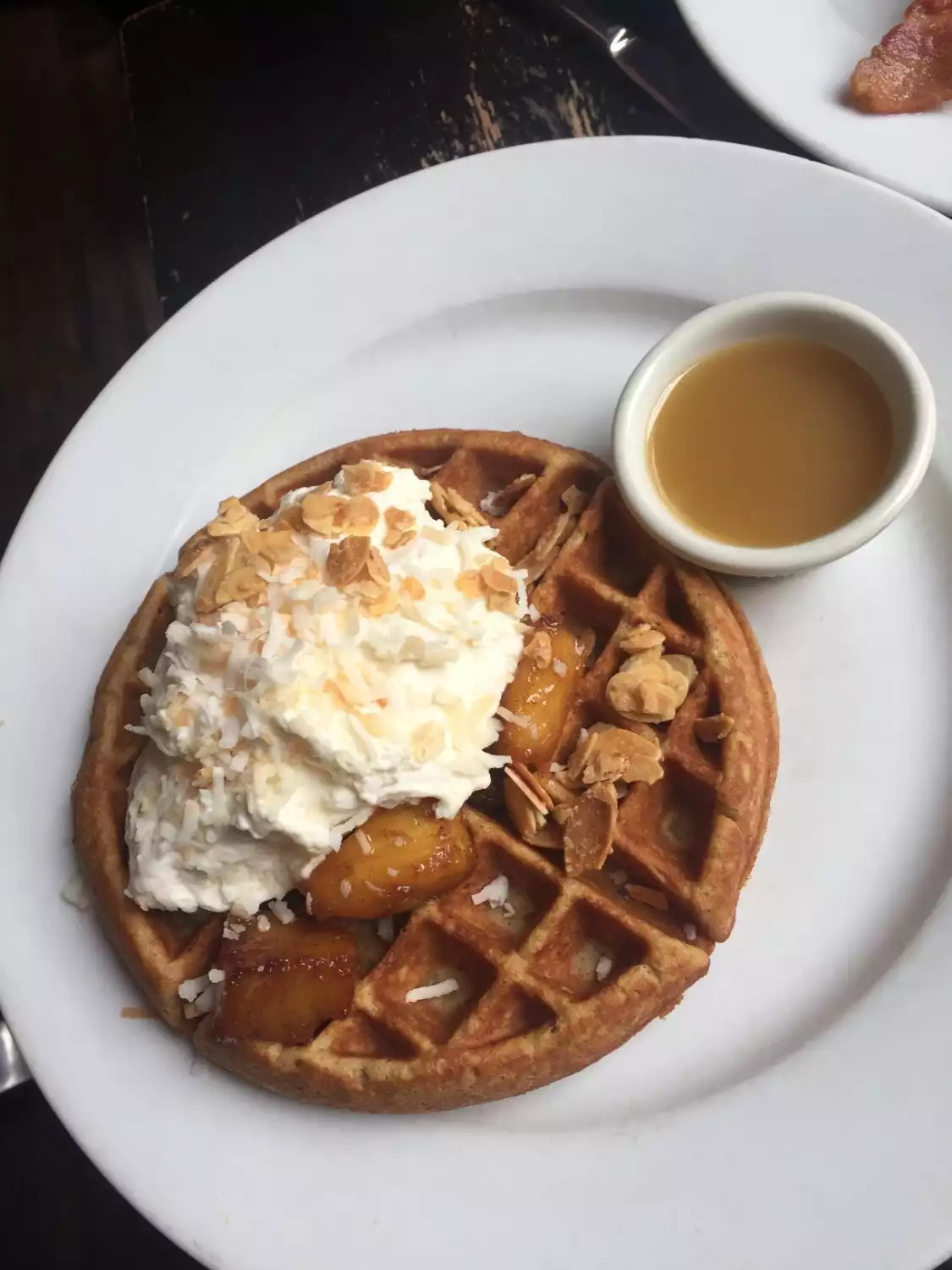 The brunch choices were interesting with some things for every appetite. We had the BELT (but with egg) waffle special with mixed fruit and thefrench toast with maple syrup. The service was quick and friendly. It is a boisterous environment so don't plan to whisper sweet nothings to your partner. Great find.....can't wait to return.