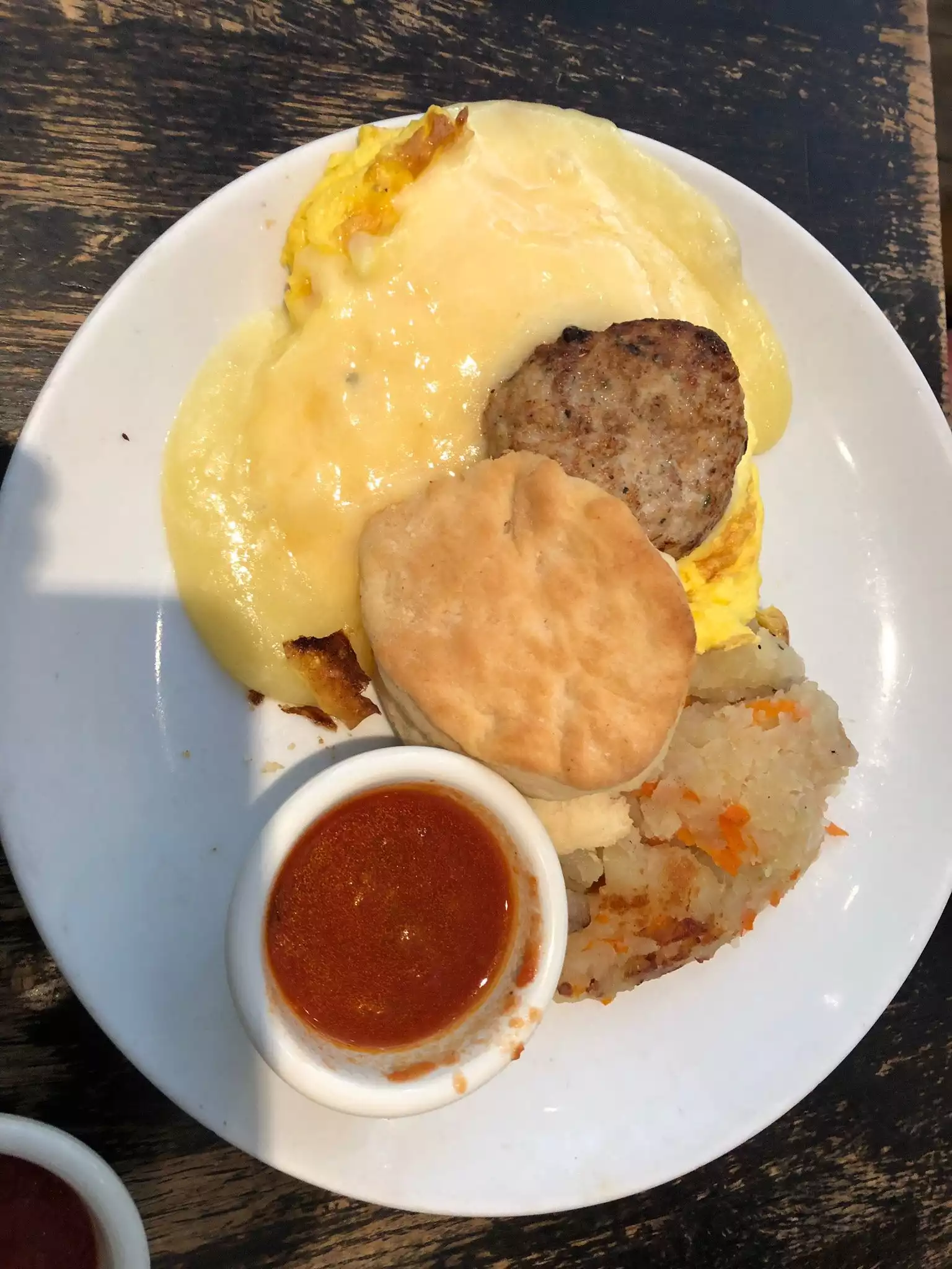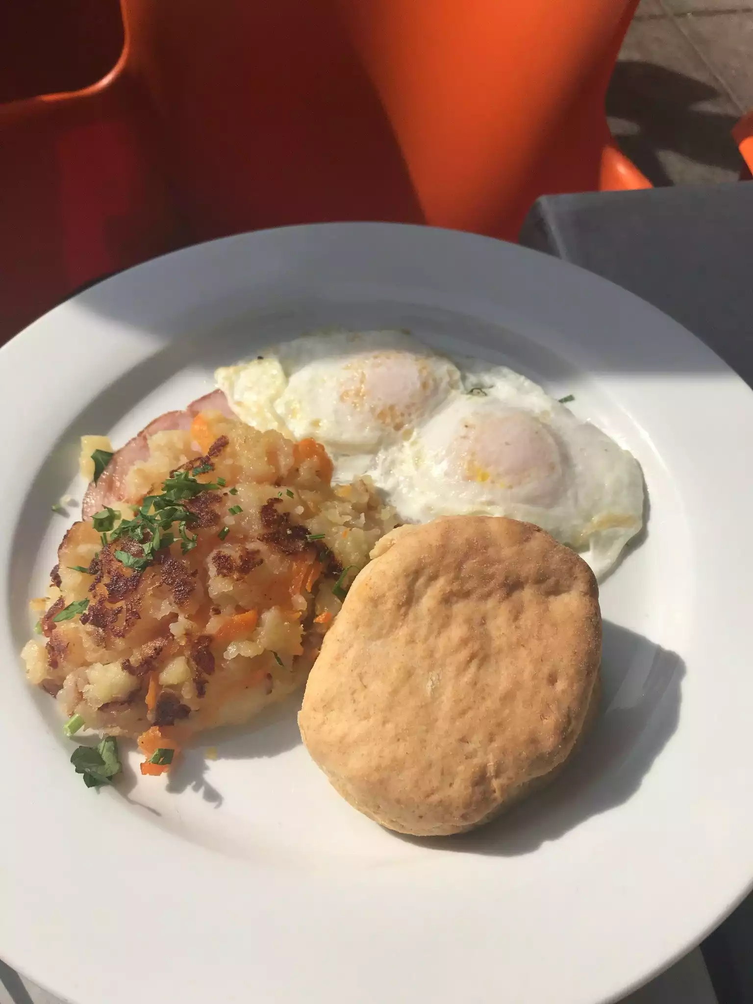 ...a buttery biscuit, an enviable egg scramble and melty cheddar cheese. And it was cool enough and quiet enough to eat on the sidewalk (restaurant side not street side).