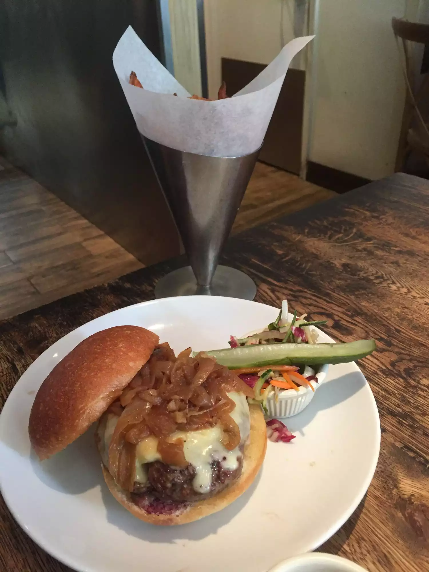 The worst thing about this place is deciding what to order from the diverse menu. I ordered the veggie burger and unlike most non-meat patties, this one stayed together and didn't fall apart, making it a graceful meal. It comes with a huge side of fries which are garnished and can be eaten without any sauce. The waitress was kind despite the crowd and food/drink came promptly. Great place for 2 people to sit and relax and conversate. I will be coming back!!!!