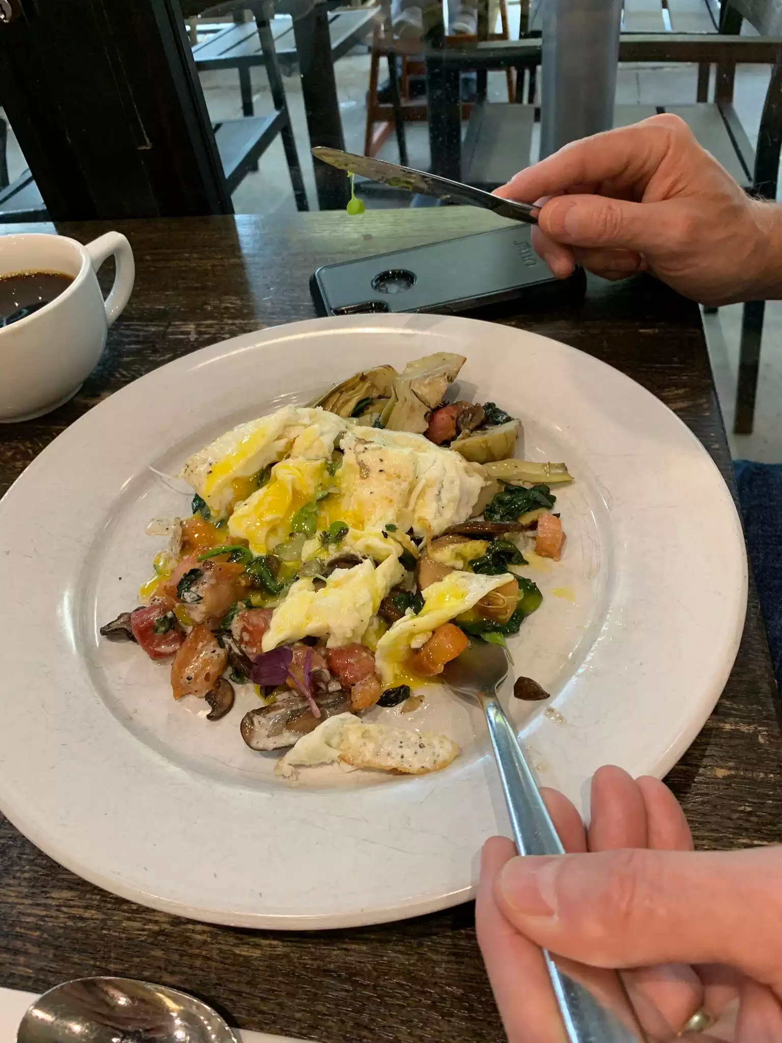 Went after moving our daughter into Columbia. There are so many options around the campus, but this one had a line - a promising sign when other restaurants had empty tables. I had the eggs florentine on a whole wheat biscuit, accompanied by artichokes. The chokes were a little undercooked, but the eggs and hollandaise sauce were great. Burger was good as well. The frittata looked great, but it was a little asparagus forward for my tastes. Coffee was great.