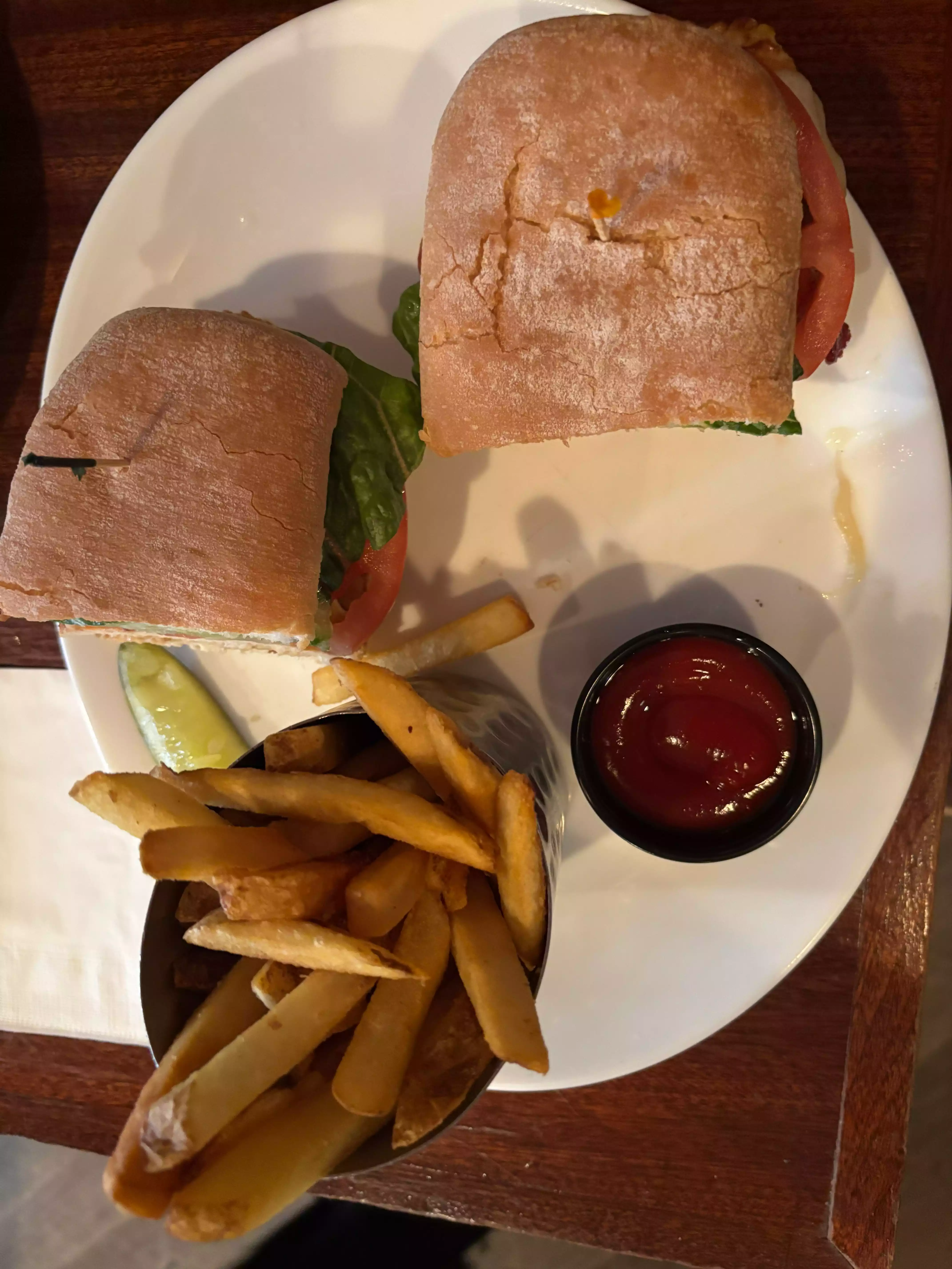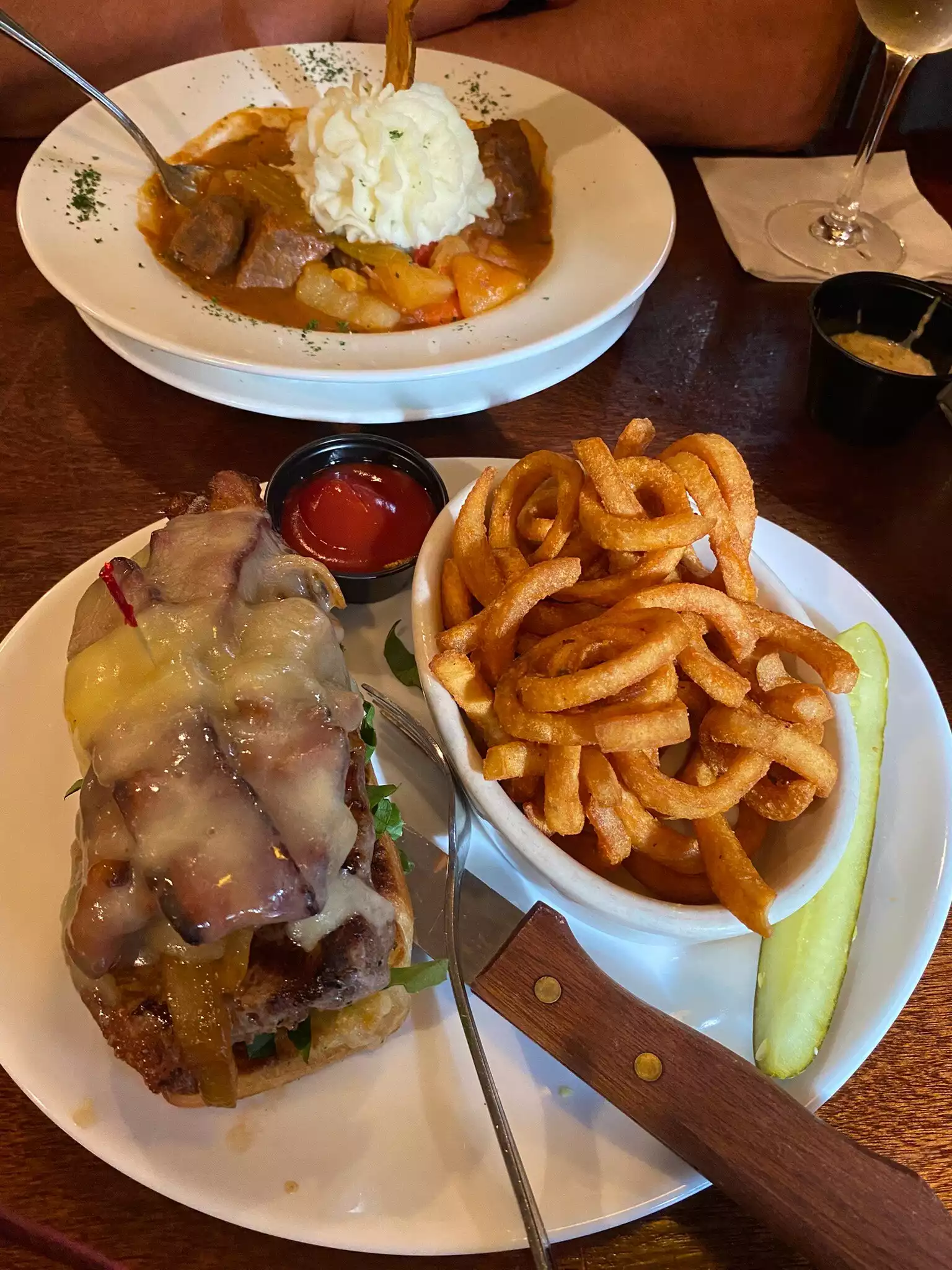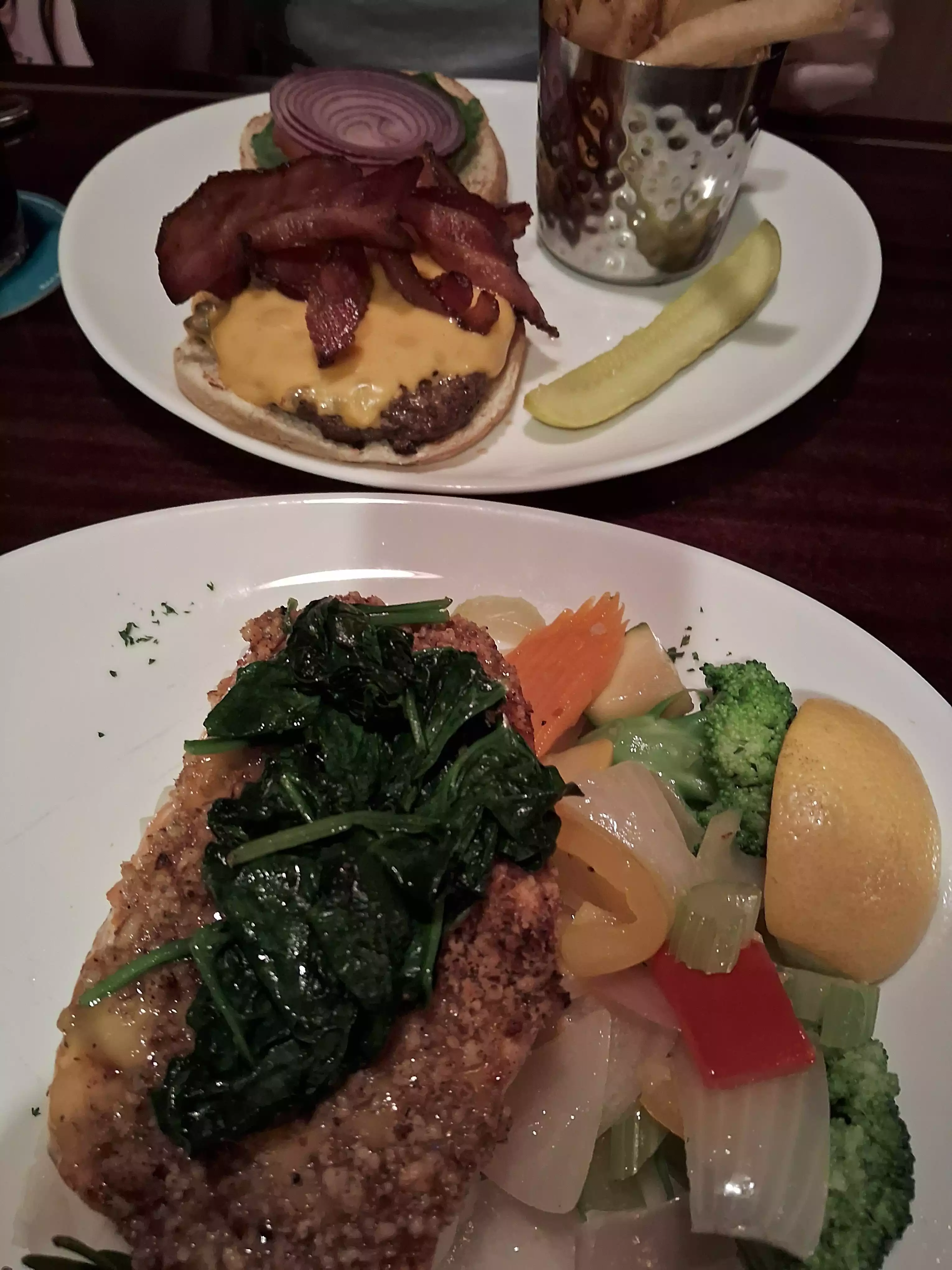 Our server was great, funny, attentive but not annoying. Burger wasn’t cooked right (MW not MR), so wasn’t juicy and a bit dry. chicken pot pie was good though. Creamy flavorful. Food served quickly.