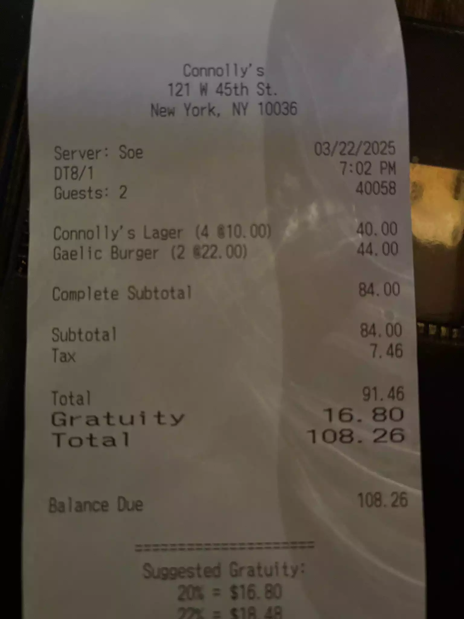 Our first impression of Connolly’s was great. The service was friendly and efficient, and the food was good and tasty. Portions were generous and the draught beer was good too ( the wine wasn’t great) but the evening took a downward turn when we got the bill. Although the service charge wasn’t added on automatically ( good) there was a 3% charge for using a credit charge. I assume this is just a New York thing as I’ve never experienced it elsewhere and it happened twice in 3 days in Manhattan. Why? Doesn’t everyone use cards these days?