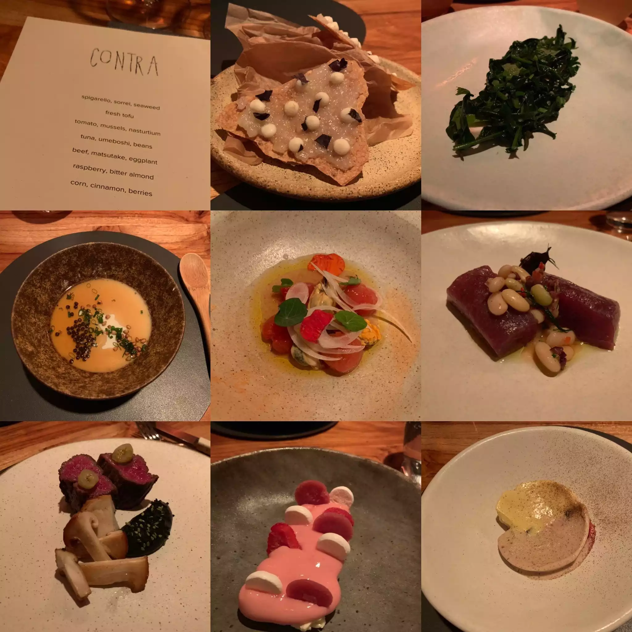 It took a while to get reservation to Contra, so plan as soon as possible. The tasting menu was wonderful. I even tried the fresh tofu and it was delicious. I devoured every single dish and they were all very tasty. Dessert was delectable. Service was impeccable. The only drawback is that there are no substitutions.