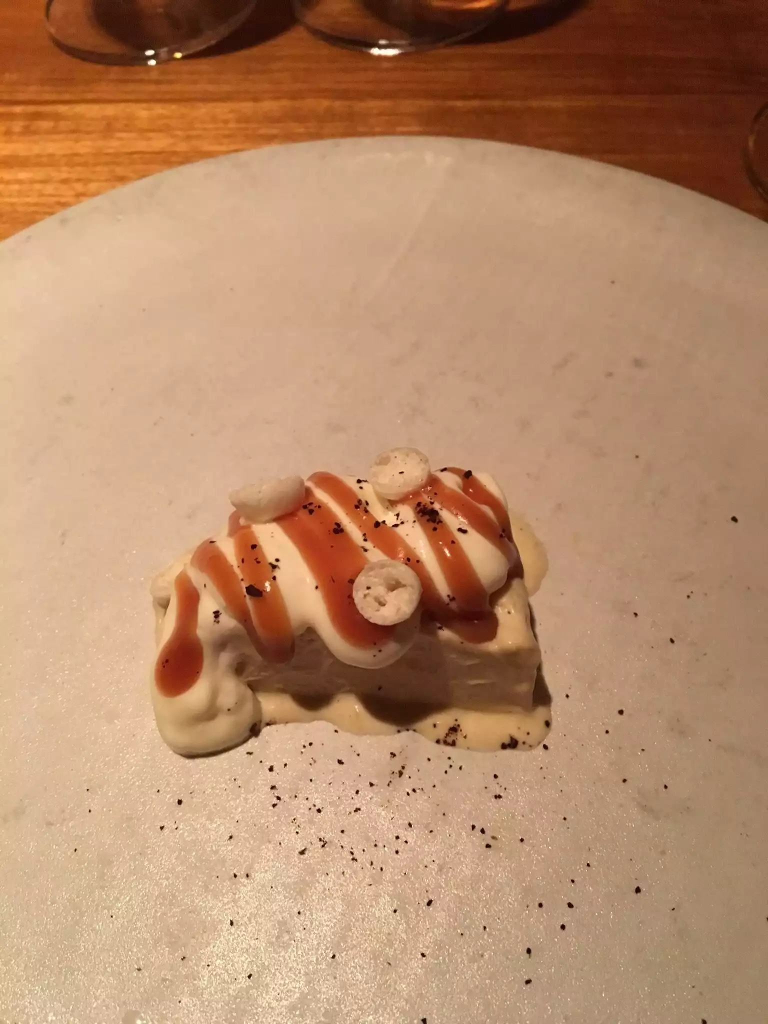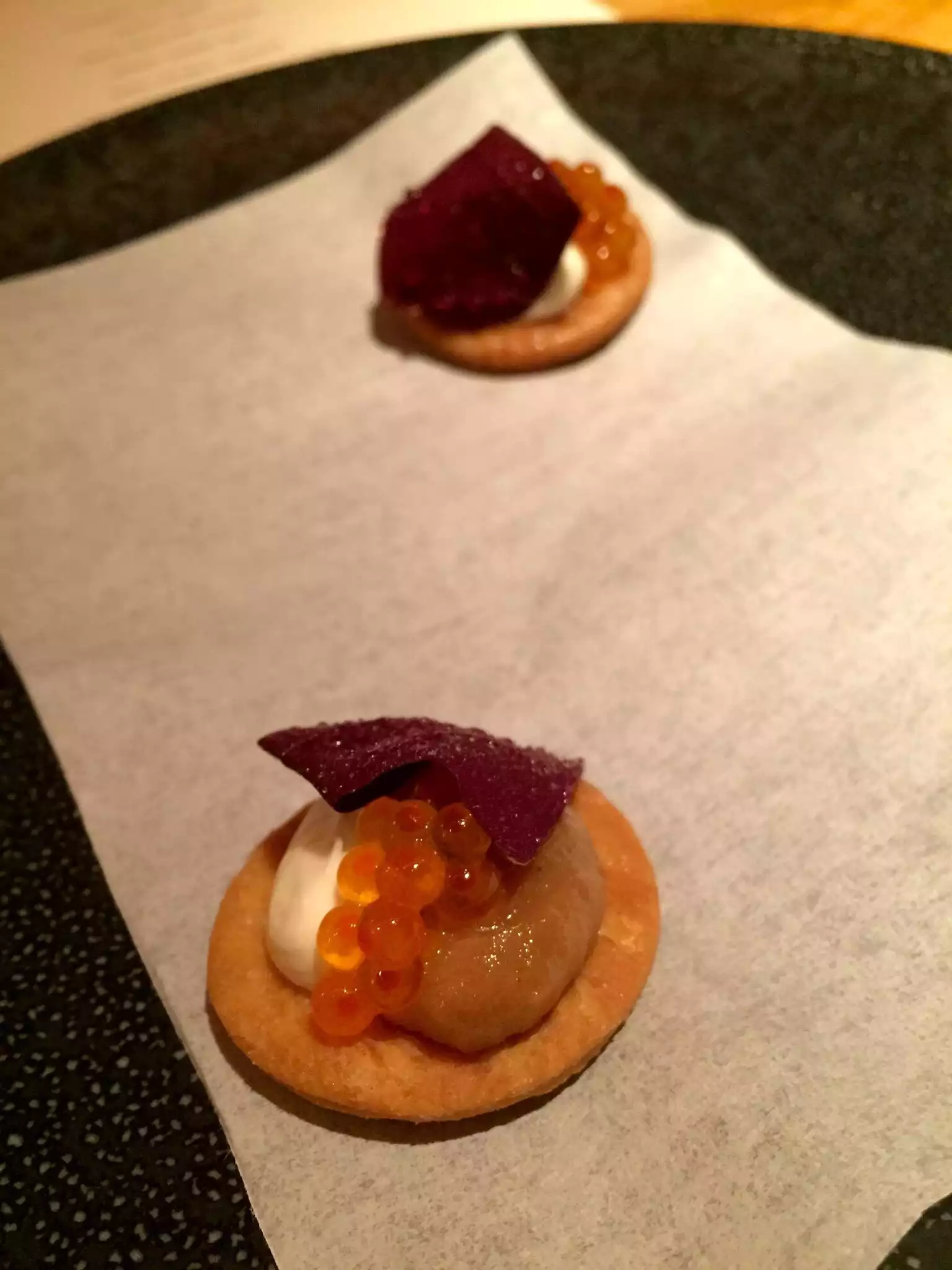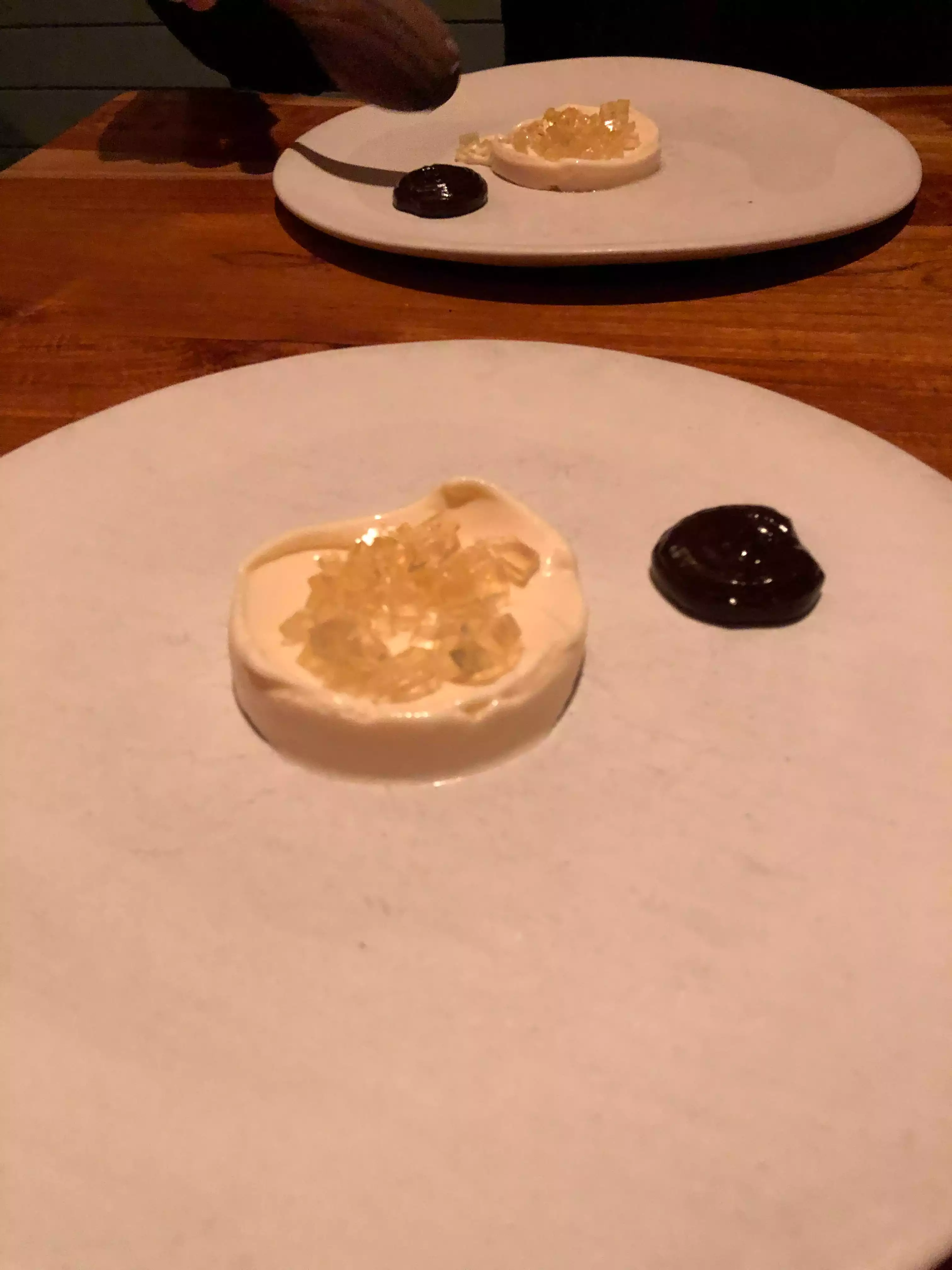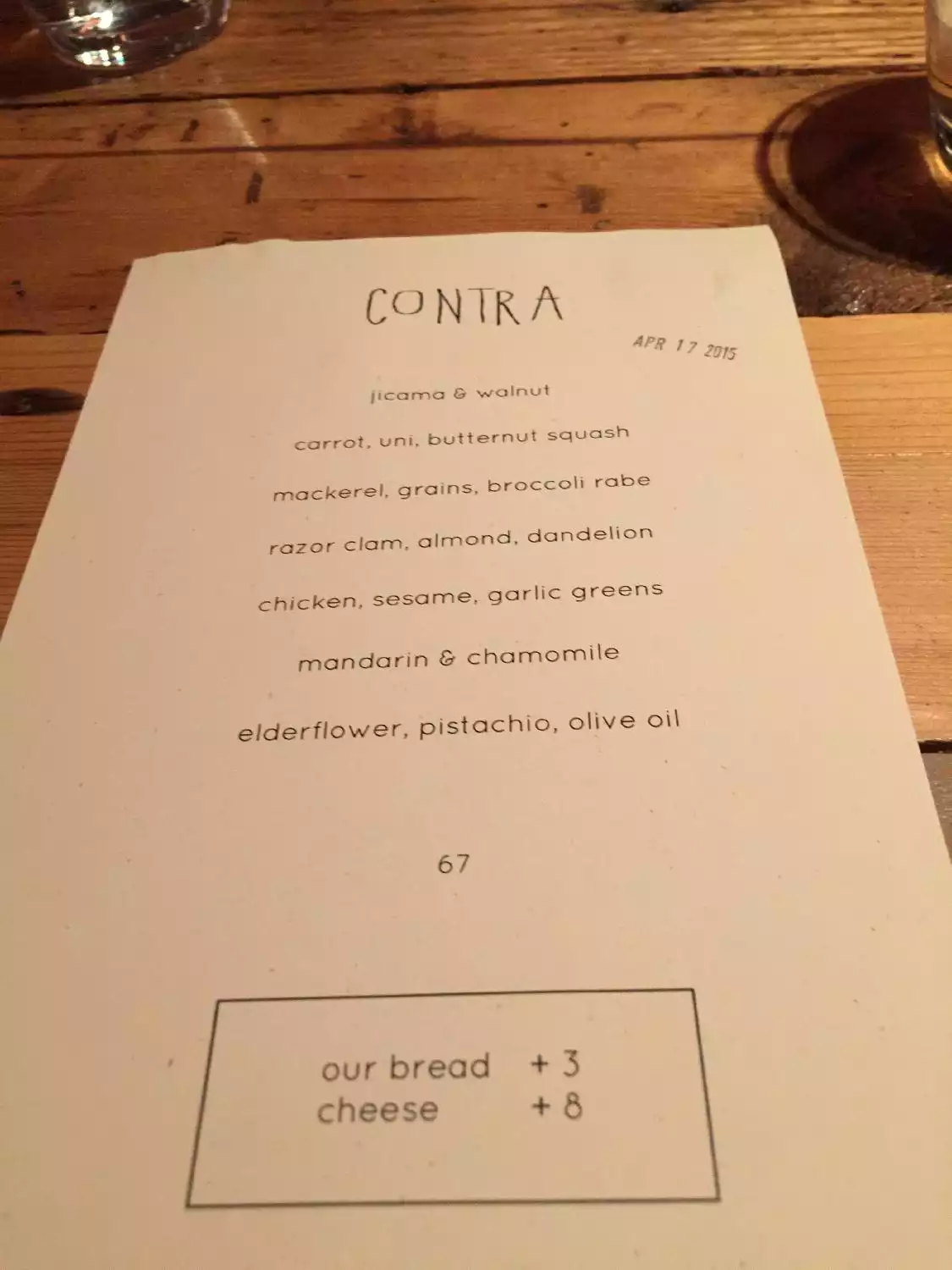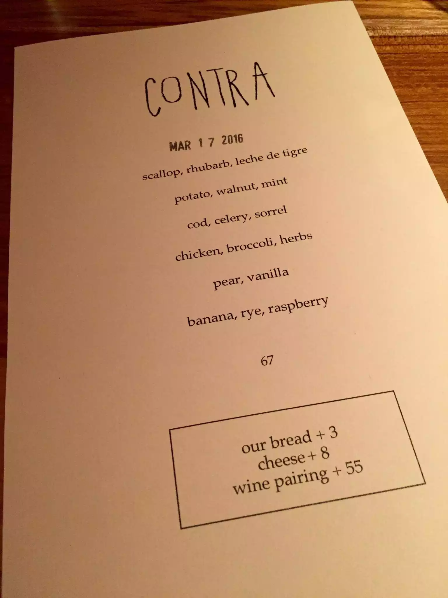 I've been wanting to try Contra for a while. Came once before but had to leave before being able to try anything. The price is reasonable and supposed to be a creative menu. I was generally underwhelmed. The bread was very good. Beyond that, nothing really stood out. All fine food just not impressive. Desserts were better than the savory dishes.