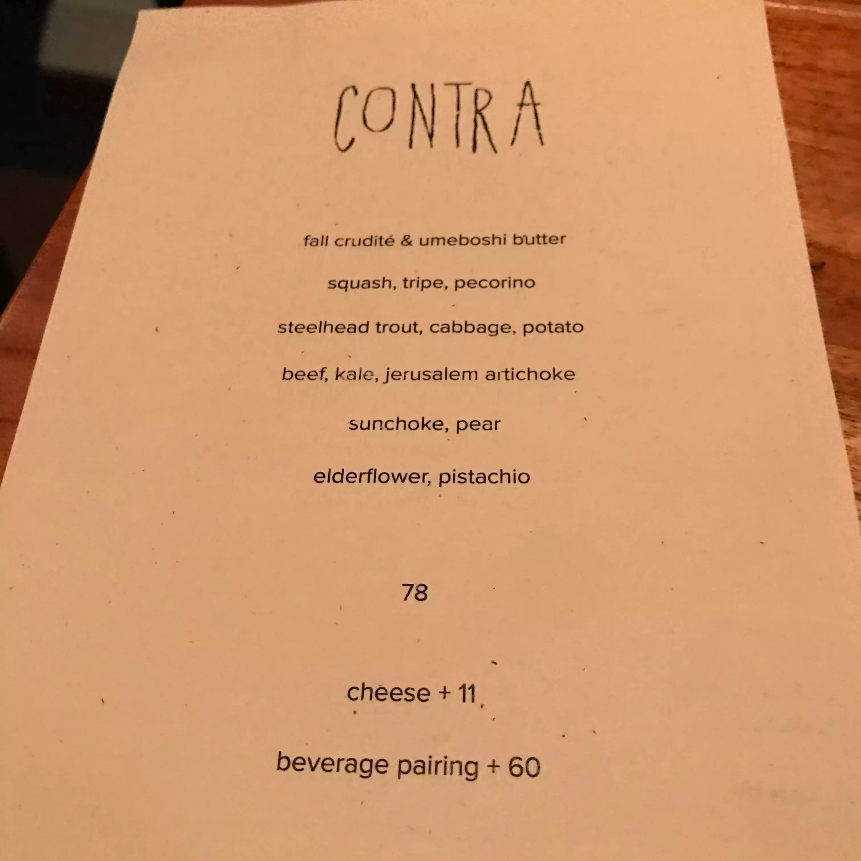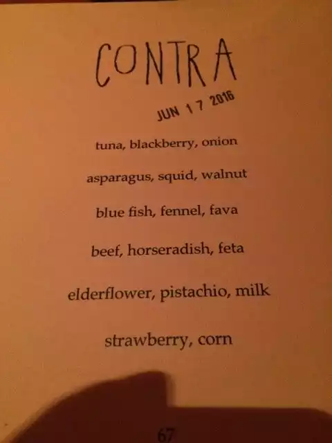 I had Contra at the top of my list of go to New York restaurants and was quite excited when I secured a reservation. It was a wonderful experience. A six course tasting menu full of creativity and wonder. And the desserts were just superb. Beautiful little restaurant with a great decor and vice. Excellent service.