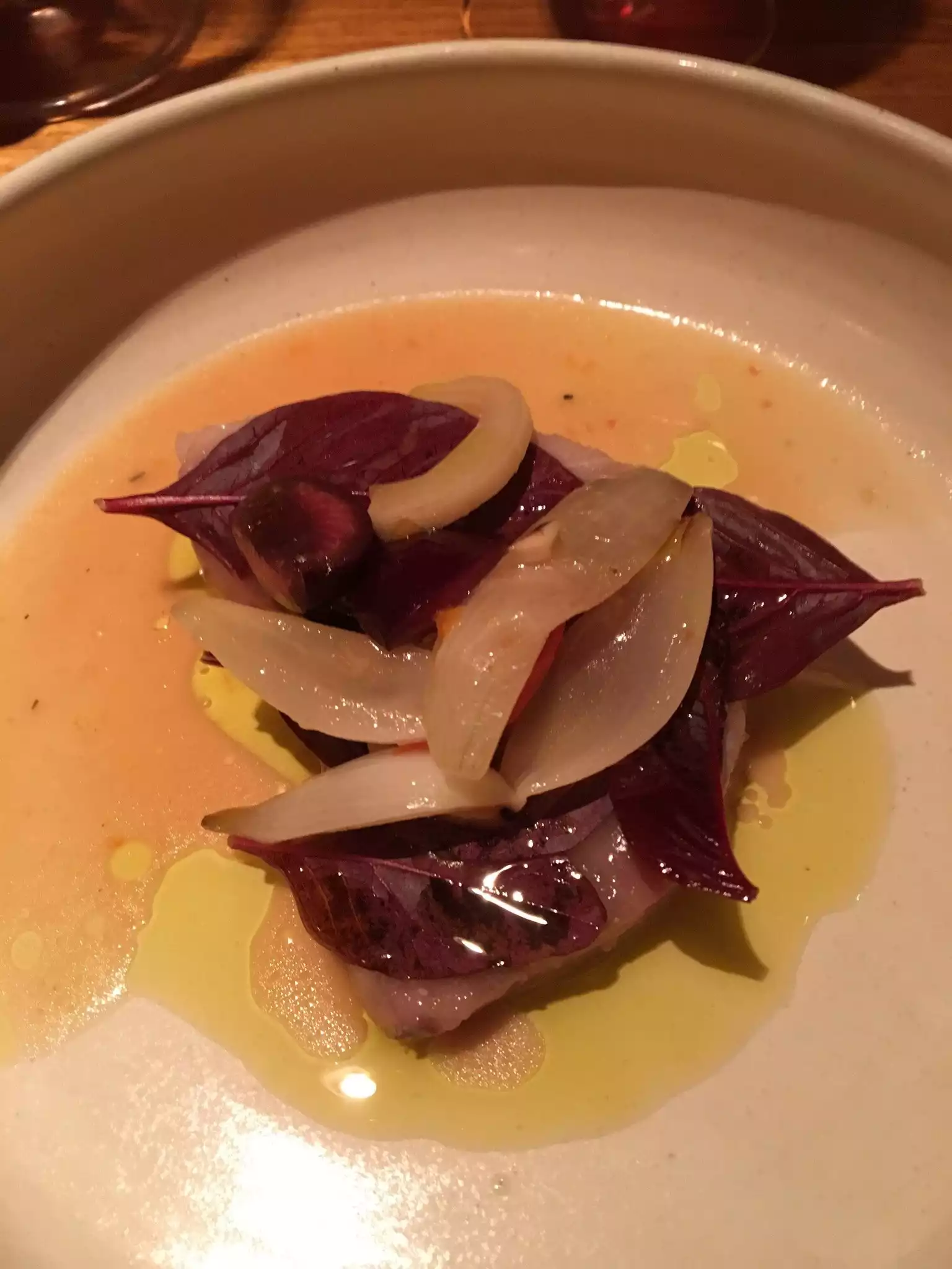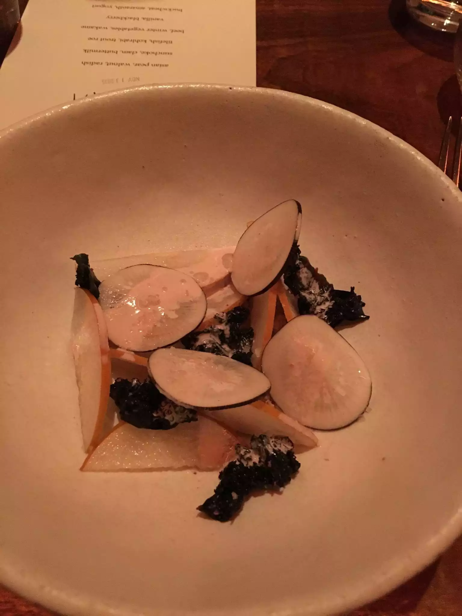 one 5 course menu to "chose" from and all the better for it. Once seated in this trendy & relaxed restaurant, you are presented with the menu, which, given its mandatory nature, serves only to hint at the wine pairing (which is optional). Thankfully, a sommelier was at hand and he offered to recommend his personal favorite which we happily took. Thus, we were able to place out foor & beverage order in record breaking time. All 5 dishes tasted great with just the right amount of creative twist and so did our orange wine from Sicily at a very reasonable 60 USD. However, I couldnt help noticing that it is the some menu I saw on a february review, which makes me wonder how often they change it. A set menu is a great idea but you need to make sure it keeps changing or you ll soon bore patrons.