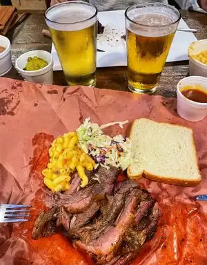 We found Cooper's in downtown Austin after trying a couple of the better known BBQ spots but found long lines. Apparently, long lines for BBQ are common in Austin but we didn't have the time (or desire) for that. Cooper's turned out to be a great alternative. They had a few people in line and we got our meat order very quickly. We skipped sides and just stuck with the complimentary pot of beans. Our meat was very good. I had a beef rib that was tender and juicy. My wife enjoyed her brisket. Coincidentally, we took a food tour the next day and they brought us back for more brisket. We recommend Cooper's