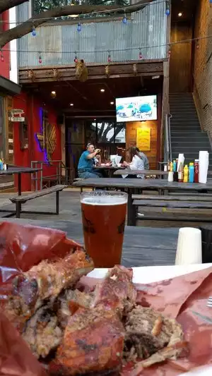 Best BBQ we ate on the trip. Far superior to Terry Black's BBQ. Conveniently located in Downtown near the JW Marriott, within walking distance from Four Seasons and other major hotels. Tender meats, well seasoned inside and outside, not too salty. Corn bread is a must get side. Husband said, "Cole slaw was fantastic." Walk in and get to the counter along the wall, pick your meat, then walk along the cabinets to pick out bottle drinks and salads. Then you hit the hot sides. Get the corn bread! Proceed to check out. After checkout, there's a free condiment station for all you can get: - House made BBQ sauce, wee bit on the acidic vinegar side - house made pork beans - onions - pickle slices - real silverware & wet naps (you get cheap plastics at Terry Blacks that can't cut anything) You can bring your canteen tray of meat to sit at the bar. Be sure to say hi and chat with Jim (bartender). Super nice and you can make a friend or meet a fellow traveler sitting at the bar top. The staff have all been here and worked together a long time. You hear stories of them painting the walls, putting together the chairs you sit in, and see their family and kids photos on the way. Plenty of group tables and benches around. I cannot recommend enough to come here for Texan BBQ, Austin hospitality, and a great memorable experience. While we were here, the Health Inspector rated them A. Very clean in dining area and clean kitchen. Tour upstairs to see the reclaimed wood used from the old Flamingo dance hall nailed to the ceiling. Huge tents in the outdoor back patio. The venue is massive.
