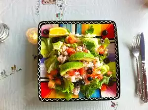Expensive for a salad where the shrimps are very probably out of a tin and the dressing is sharing the bottom of the plate with water coming from the green salad.