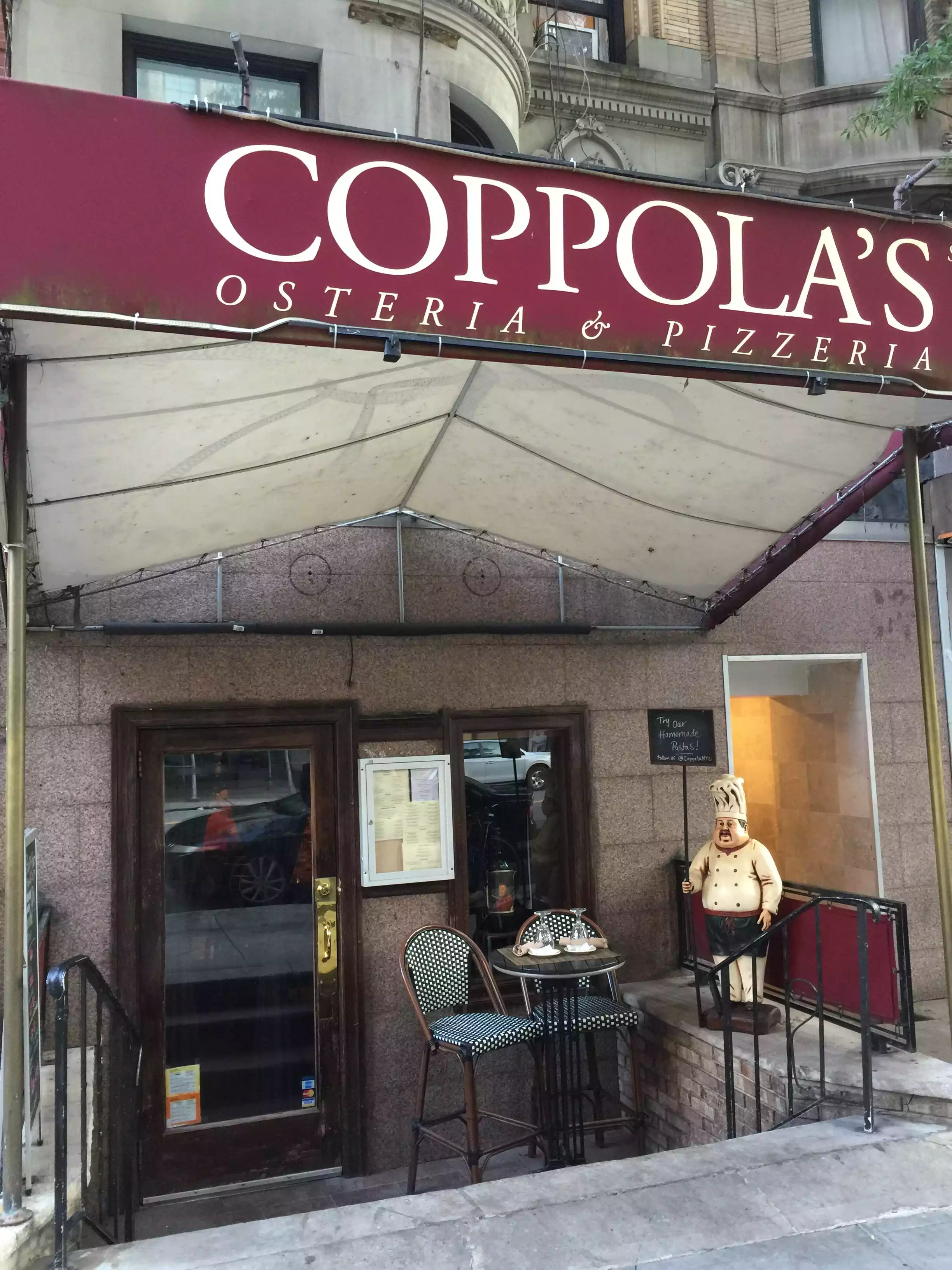 We read other favorable reviews on TripAdvisor and wanted an Italian restaurant in the neighborhood, so we booked at Coppola's. Not disappointed. We were promptly seated and a very nice and professional server took care of us. We enjoyed the complimentary appetizer. The portions were very large but I managed to finish the eggplant parmigiana. It was that good. As in many NY restaurants, it was pretty noisy, but that's par for the course these days. Would go again when in NYC.