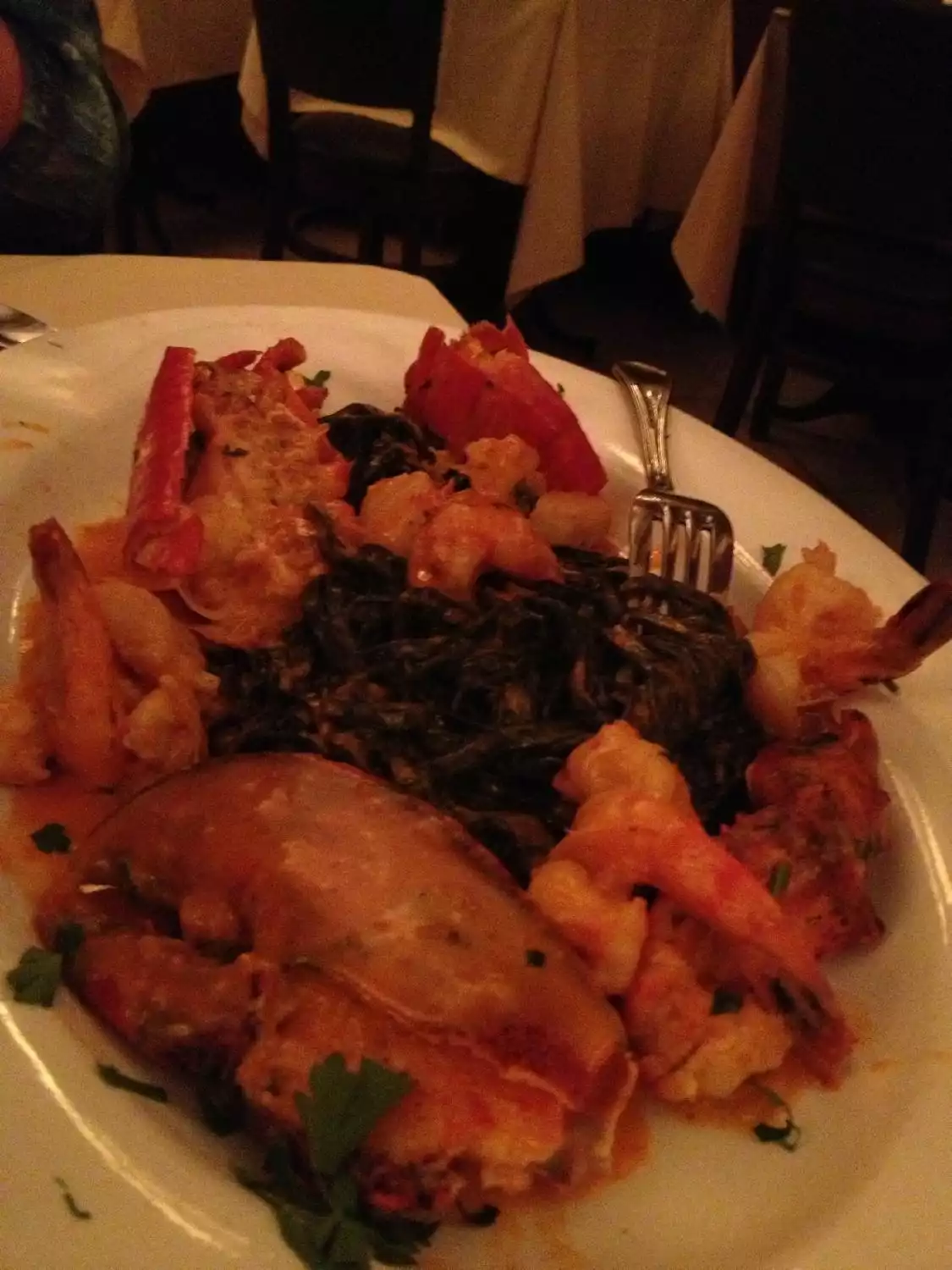 Great Staff, great food. Try the black ink linguini in pink sauce with lobster,shrimp,and scallops . First had the fried calamari at the bar with the house Pino. Better then Santa Margarita. At the table we had mussels and baby clams in a red sauce. Then to the Black Linguini. I have eaten here many times along with the most picky eater I have ever met. This place is tops.