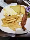 Visited twice during layover at MIA courtesy of Priority Pass, which "deducts $30 p/p from the bill". Note that the restaurant automatically adds 18% tip to the bill. So far for the small print. Ordered BBQ burger on the first visit. Forgot to substitute chips for fries, but for $4 extra got a plate full of soggy lukewarm fries. Yikes. Burger was OK-ish: pile of boiled(?) pulled pork with blob of BBQ sauce. The coleslaw mas made similarly: fresh shredded cabbage with a generous splash of a mayo-based sauce. Almost a DIY meal. My drink was the frozen Sauvignon Blanc which I wouldn't order again. We visited for breakfast a week later. The bloody Mary's were tomato-y despite asking for spicy. They ran out of teabags (!) so no hot tea. Waffles took 20 minutes to finally show up burned. The second attempt arrived promptly, cooked perfectly but tasted chalky. We got two bottles of water to go which was a nice gesture. Bottom line: I would not eat or drink here if I had to pay for it.