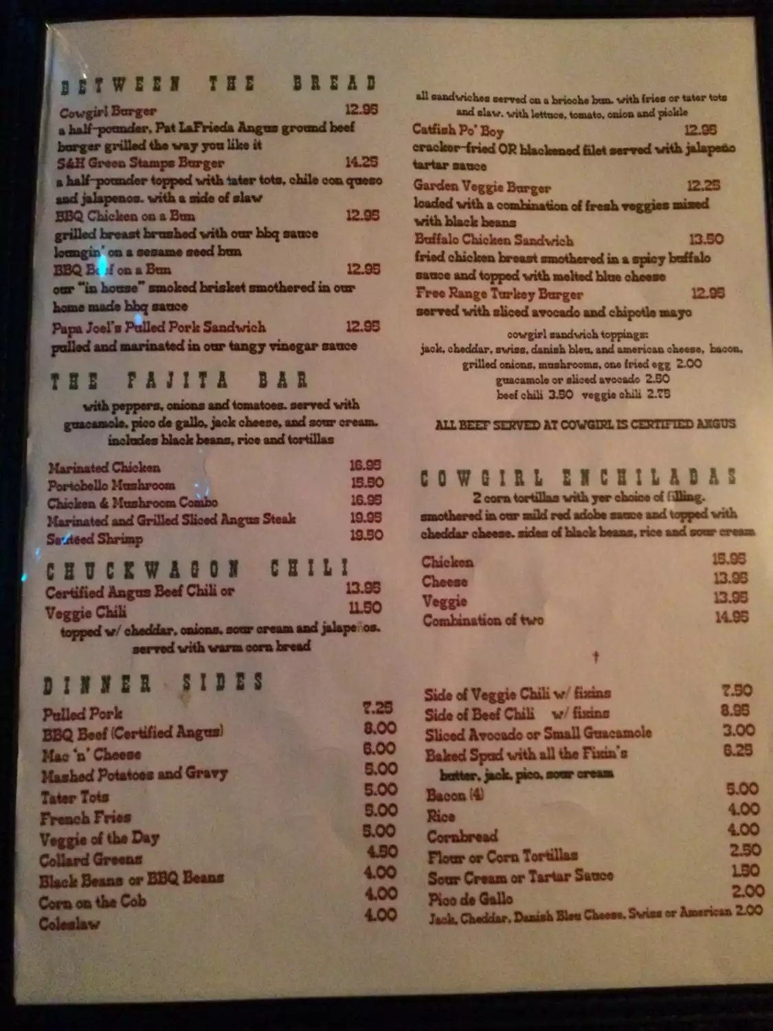 Visited Cowgirl for the first time with my brother, who has been there regularly. Absolutely terrific food - there were four of us and all the meals were great. Servers were very friendly, and it definitely felt like you were going "where everybody knows your name". Had a great time and would go again.