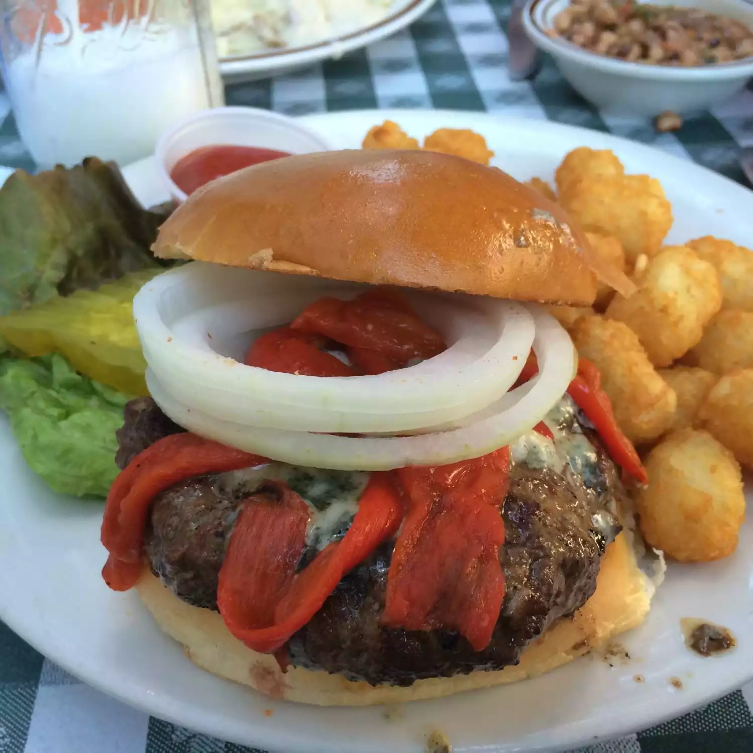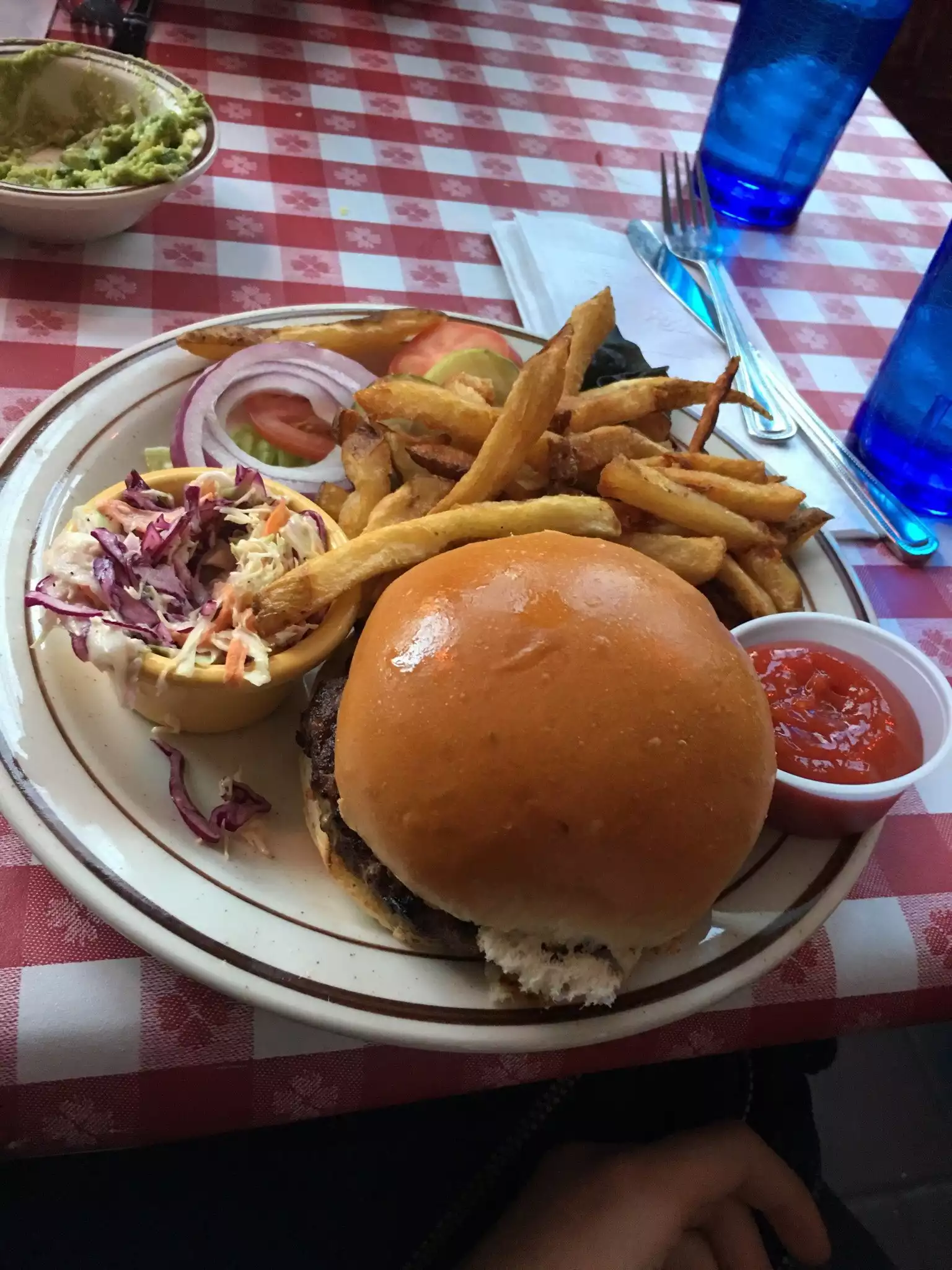 Married friends of mine live on Hudson and wanted to get together for dinner. They wanted to go to Cowgirl-I had never been so off we went. We were seated immediately and water arrived at the table. Menus were presented. My friends both ordered cokes and I decided to stick with the water. Cowgirl is two storefronts put together and decorated in a very funky style. The menu is southern, barbeque, tex mex and even cajun. Appetizers, salads, burgers, fried chicken, vegetarian options, a fajita bar [that option looked great] numerous options for sides, desserts and drinks. There is a large cocktail menu as well. As you walk in, there is a large bar-off to one side are tables and towards the back are tables as well. There was a large room that was not being used and was probably utilized for private parties. The restroom is located downstairs and was clean and well maintained. Getting back to the menu, it was difficult to make a choice. I ended up getting the Cowgirl burger medium well which came with lettuce, tomato, onion and pickles. I opted for a slice of American cheese as well. There are other burger toppings you can choose from [bacon, grilled onions, sauteed mushrooms, etc.] which cost extra. The burger came with french fries or tater tots-I opted from the tater tots. There were quite a few of them along with a small vat of coleslaw-on the drier side which was great. Mustard and ketchup were included. The waitress was extremely pleasant, perky and very accommodating and stopped by to see how I was doing. I would recommend and return-my friends made an excellent choice.