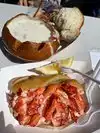 Clam chowder in a bread bowl piping hot on a cool day along with some shrimp! Yum! No waiting just fresh seafood now!