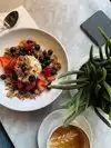 I popped in for a quick lunch, having read the good reviews on Googke maps... Inside is rustic, spacious and airy space with a selection of high tables, dining tables & chairs and sofas with coffee tables. Outside dining is available on the pavement. Clearly a popular and trendy place to be. I ordered straight away. Waited briefly for my drink and then my food was delivered to the table. I opted for the berry smoothie...tasty but not particularly thick as its made with coconut water I believe rather than milk. For food I had the sweet potato bowl with brown rice, kale & coconut curry sauce. It was tasty but not particularly hot. Service was quick and efficient, it could've been a bit friendlier but I guess they serve a lot of customers each day. Price wise it's typical, expensive US prices. I would recommend and would return. Thank you. By the way, the prices on the window outside are out of date.
