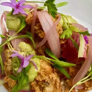 Every part of our dining experience was great. Very attentive staff and delicious food. We arrived for happy hour and had drinks with fried quail legs. Next we had the beet, arugula and avocado salad. We shared the masa fried oysters (fantastic). My husband, a native Texan, had the fried chicken livers (“best I’ve ever had”) and I moved on to the Meyer lemon white chocolate cheesecake with gin and tonic sorbet. When we eat out, we like to order things we wouldn’t typically eat at home. Every dish was just right. Our server Mark made recommendations that were spot on. So glad we happened upon Cured. Highly recommend.