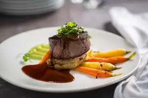 Relaxed atmosphere. Clean and quiet. Little overpriced for the quality….Hamburger, fillet, salmon and the salads were good. Steak and fries, ribeye not so good. Service was excellent, they changed the steak and fries quickly when we complained. The wine is very overpriced $95 for a $20 bottle of wine??!! Was hoping to be able to go to this restaurant every night we were staying at the hotel . Would have been very convenient. But would not enjoy this dinner experience for more than one night.