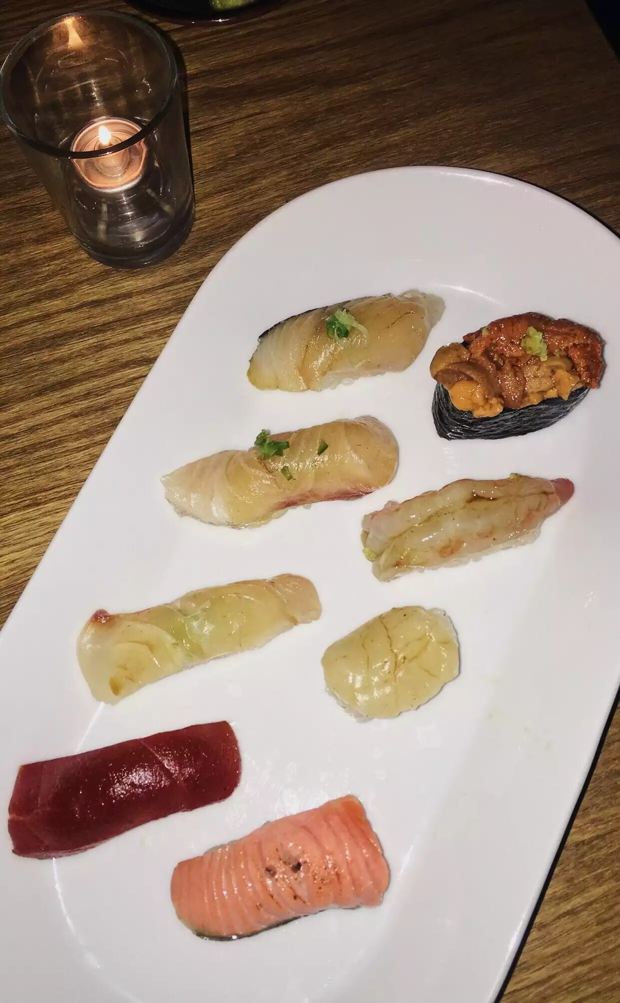 Really enjoyed my dinner here with my friends. The quality of the food was fantastic and the presentation made it feel fancier than it was. We sat at the sushi bar and had a grand old time enjoying the omakase. Just to be clear, however, the omakase is not like what you’d expect at the higher end places. A lot of the sushi came out in groups (rather than piece by piece) and seemed pre-cut/made and only placed on the dish upon order. This may turn some of you off but the food was still good. For the price, you can’t go wrong here.