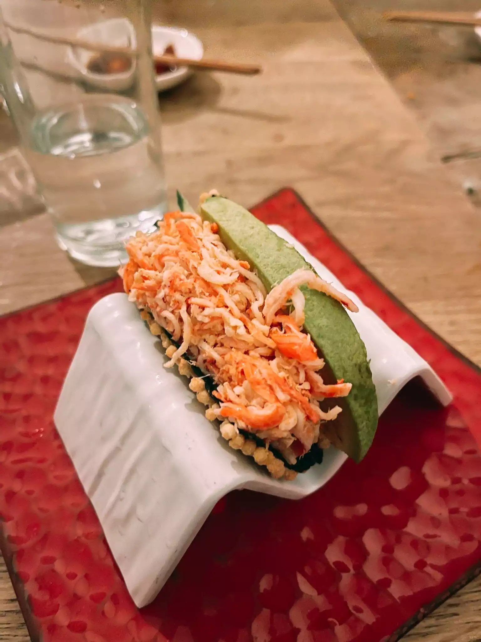 Got the Sushi & Handroll Course. Not the best chawanmushi I’ve ever had. I prefer it classic with simple flavors. The truffle jelly didn’t exactly taste like truffles, but still overpowered the egg custard. Shrimp apple salad was better than I expected. The sauce had some heat to it, which was a nice touch. After I finished, the chef asked if I was ready for sushi, which I felt was quite considerate. The rice in the nigiri was a bit salty from the chef’s all-too-liberal applications of soy sauce. However, the sea bass was an exceptional piece of fish; the flavor still shined through the soy-laden rice. The fish with picked banana was also really good (and that’s coming from someone who doesn’t really like banana). Blue crab hand roll was exceptional. Flavorful crab, warm sticky rice, crispy seaweed. The crab was really good. The bay scallop hand roll was entirely different from what I expected. I anticipated some lightly seasoned scallop, similar to what you’d get if it was nigiri. Instead, it was doused in the same Mayo as what covers spicy salmon/tuna rolls, mixed with tiny salmon roe. The lobster hand roll was good — cool, crunchy, tasty. Overall: decent food, slightly too salty, wouldn’t mind returning but also won’t be rushing back.