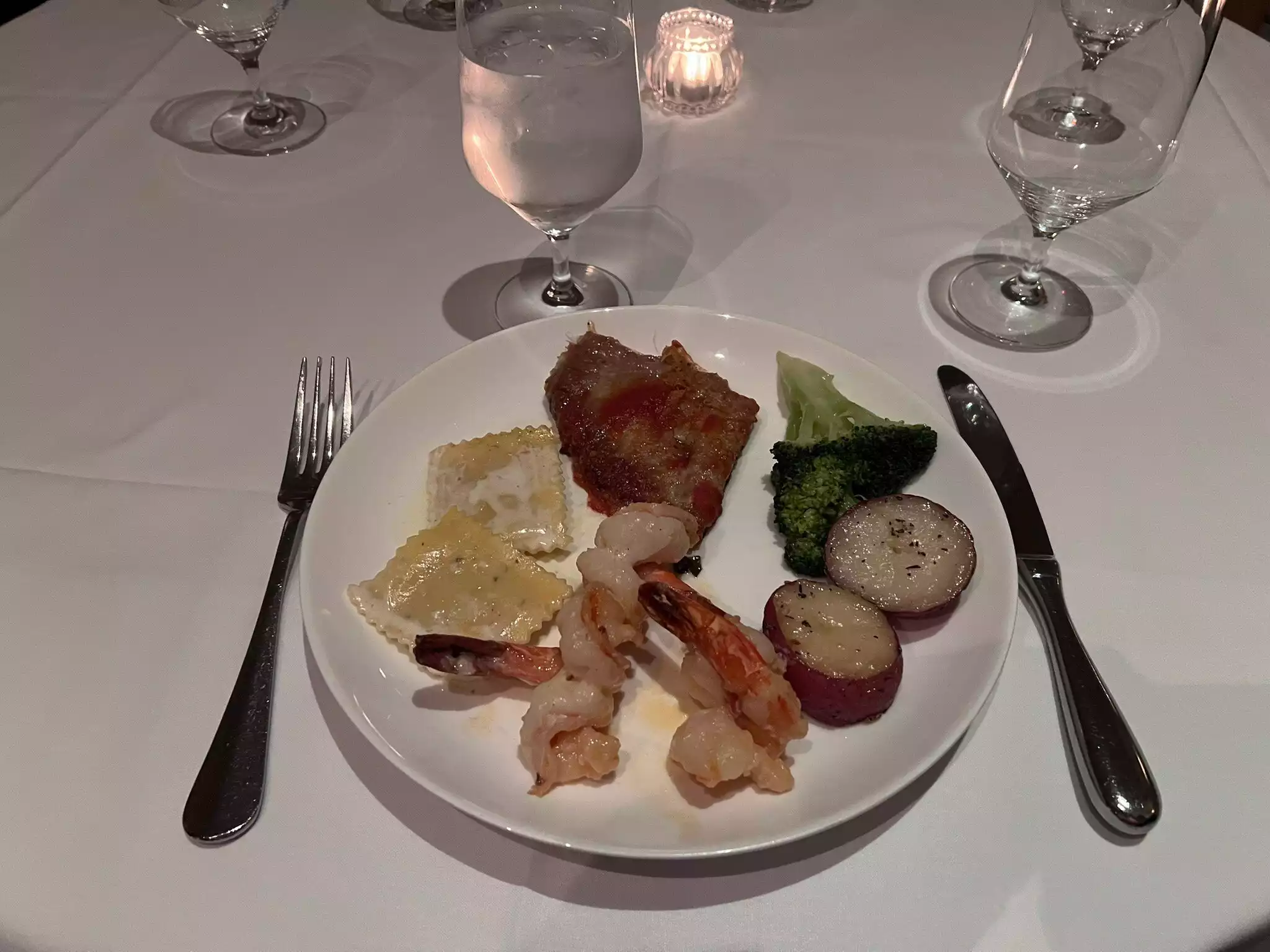 Our party of eight was late and the maitre’d was quite accommodating. The food was good as always and the service very good. However.... I felt taken advantage of by the restaurant. Two of my guests were served four thin raviolis for an entree. And the wines....every single one priced 3-4X retail when 2-2 1/2 maybe 3X is the market norm. I won’t go back. Previously, it had been a go to for large parties.