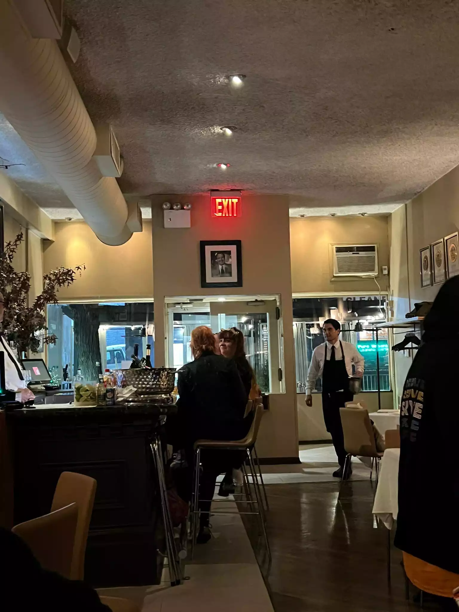Good food and service. Was seated toward the back -- close to kitchen. Was a bit noisy and not conducive to nice quiet dinner conversation. Front was like wise a bit noisy. Ask for table in middle section. Simone, the bar tender was excellent. made a nice mezcal Negroni for me. Angel hair pasta diablo was excellent as was shrimp and Caesar salad. Wines by the glass were way too pricey for what you got. The tuscan at $18/glass was a bit sour.