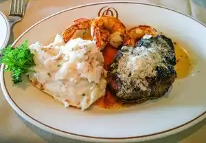 This was the best lobster bisque we’ve ever had in the 30 years we’ve been in love with the dish. We arrived early, had great cocktails in the lounge before being seated. We had a couple glasses of pinot noir and split a ribeye steak after our lobster bisque. The steak was excellent, the only flaw was instead of splitting the potato, they gave us each our own, they were huge and of course we both had to have the works. The potato overwhelmed the 1/2 steak on the plate and of course we had to eat it. There’s a lot of talk about the mandatory gratuity, the positives were they told us it was on there when they gave us the bill and it gets divided amongst everyone. We really felt like everyone on the staff was waiting on us too. The negative is you don’t get to decide what it’s worth, but it’s far better paying for staff waiting on you than paying the clerk serving you over the counter where they’re asking for tips on the credit card receipt.